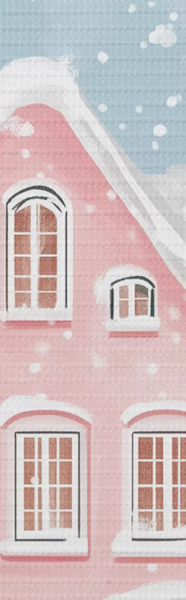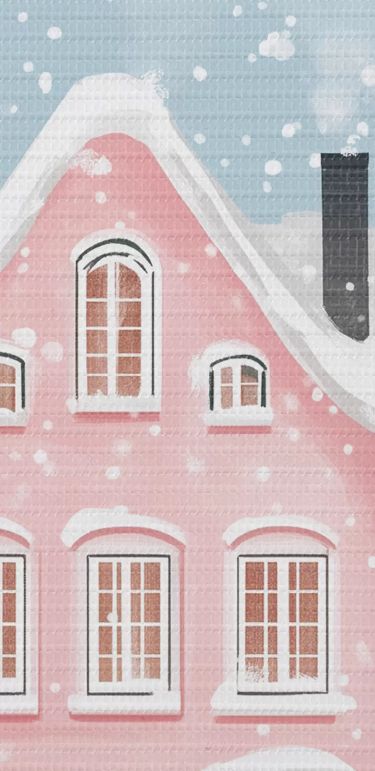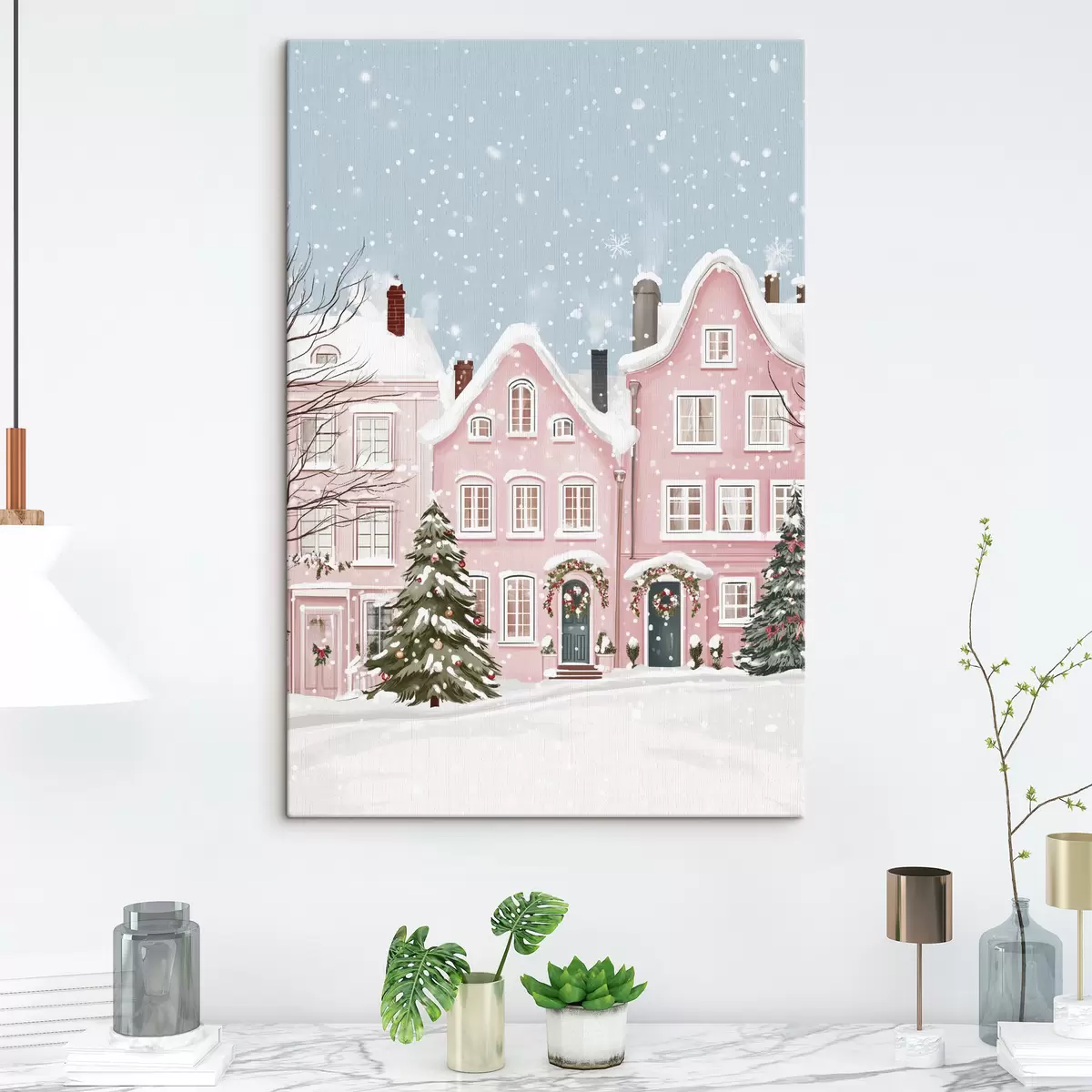 Vászonkép Gyönyörű város aranyos rózsaszín házakkal, téli esztétikával, hópelyhekkel Nr s42793