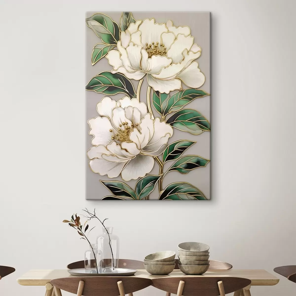 Vászonkép Fehér virágok zöld levelekkel dekoratív elrendezésben Nr s43011