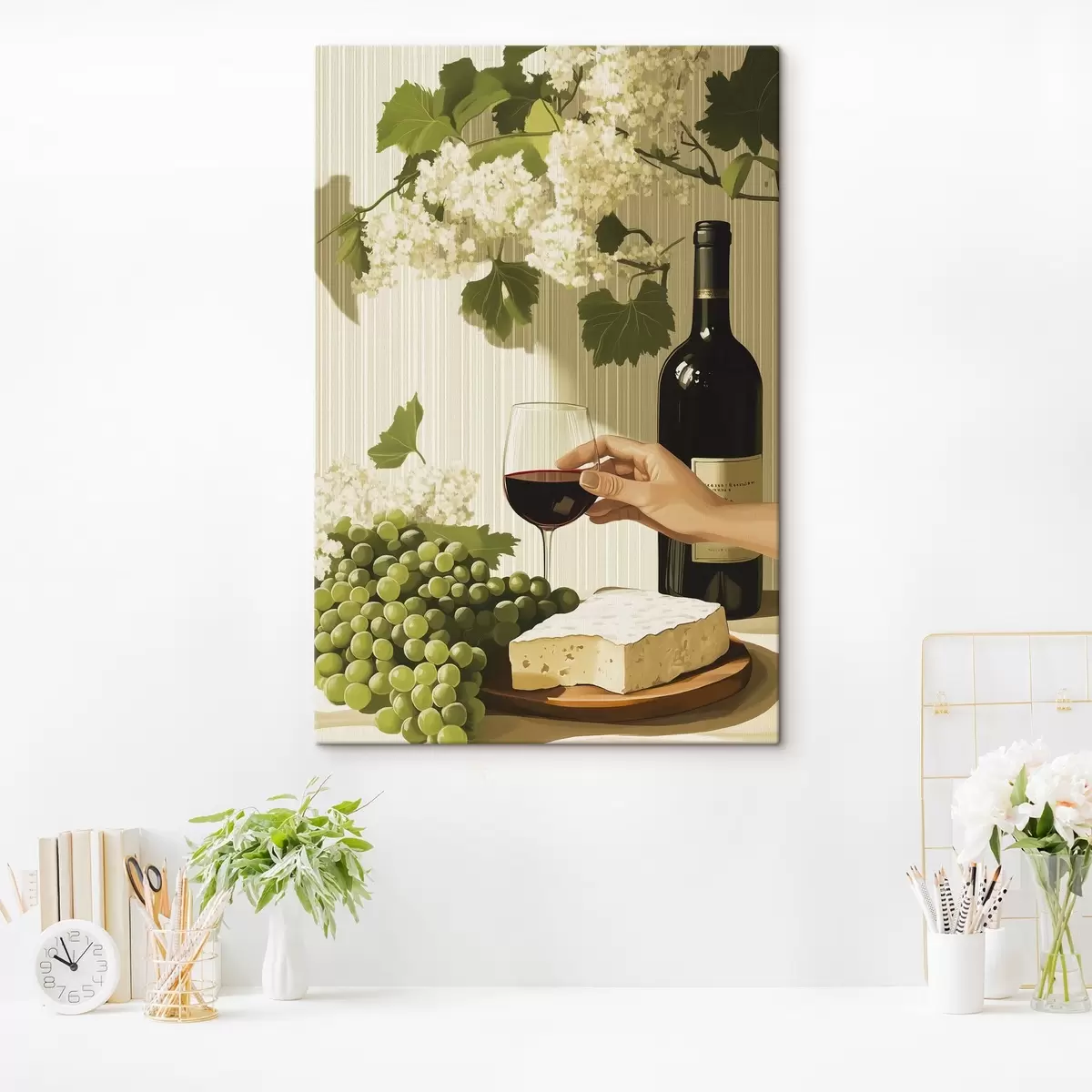 Vászonkép Szőlő sajttal, egy üveg bor, vintage stílus, fehér virágok Nr s43052