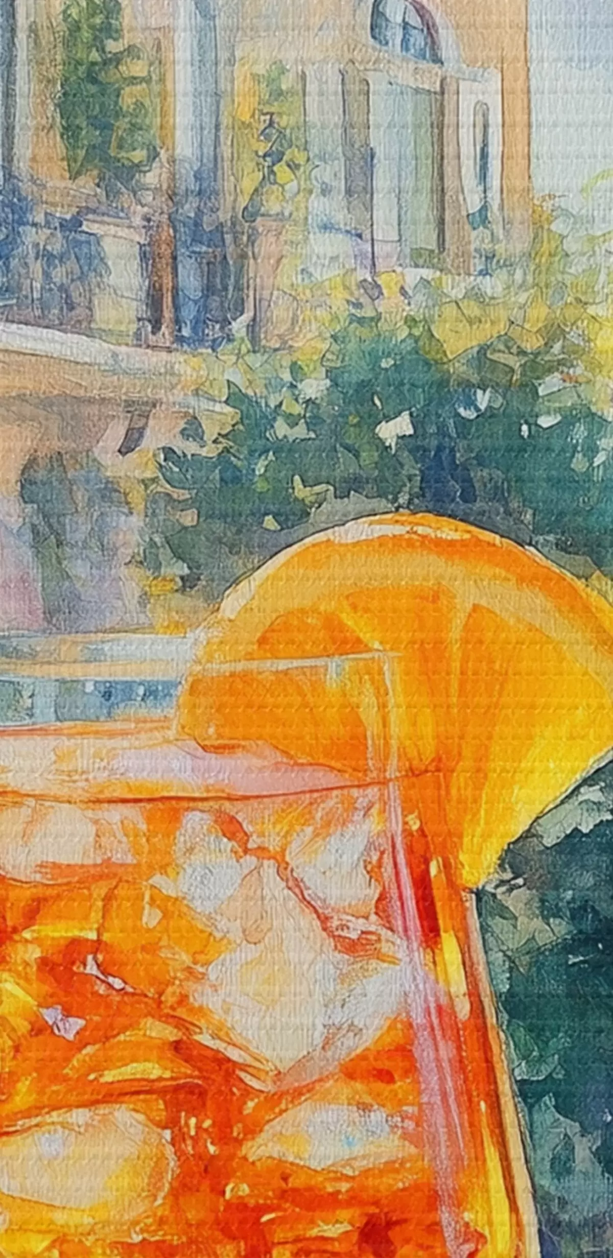Vászonkép Koktél narancsokkal, akvarell stílus, Olaszország, Aperol Spritz, építészet, nyári kert, nyári kert Nr s43061