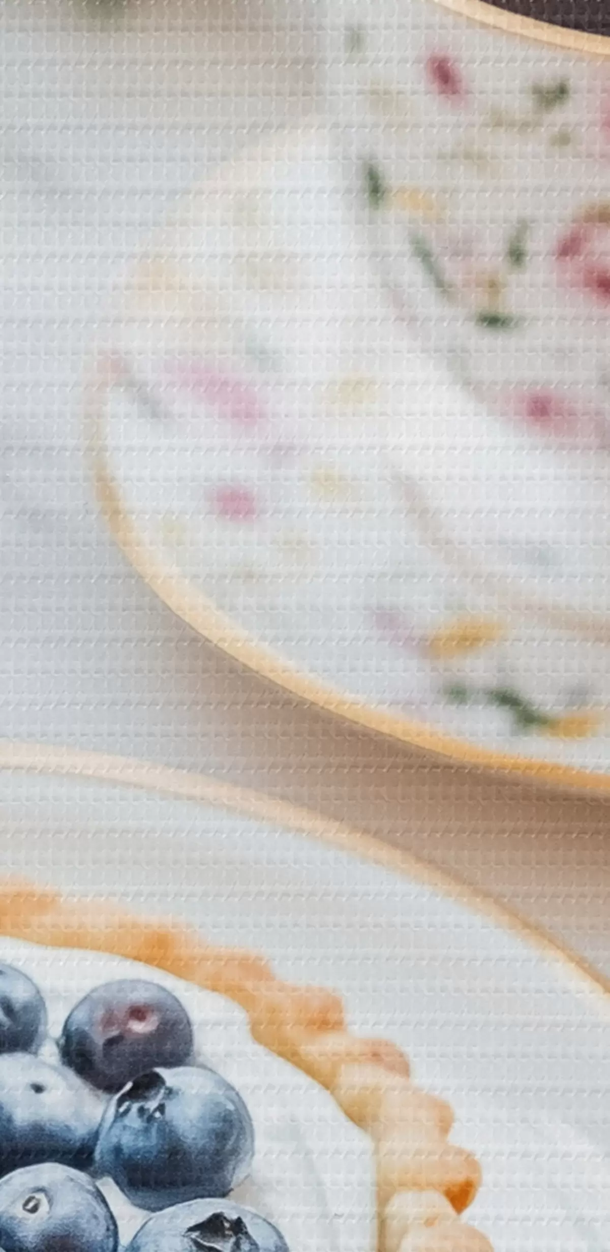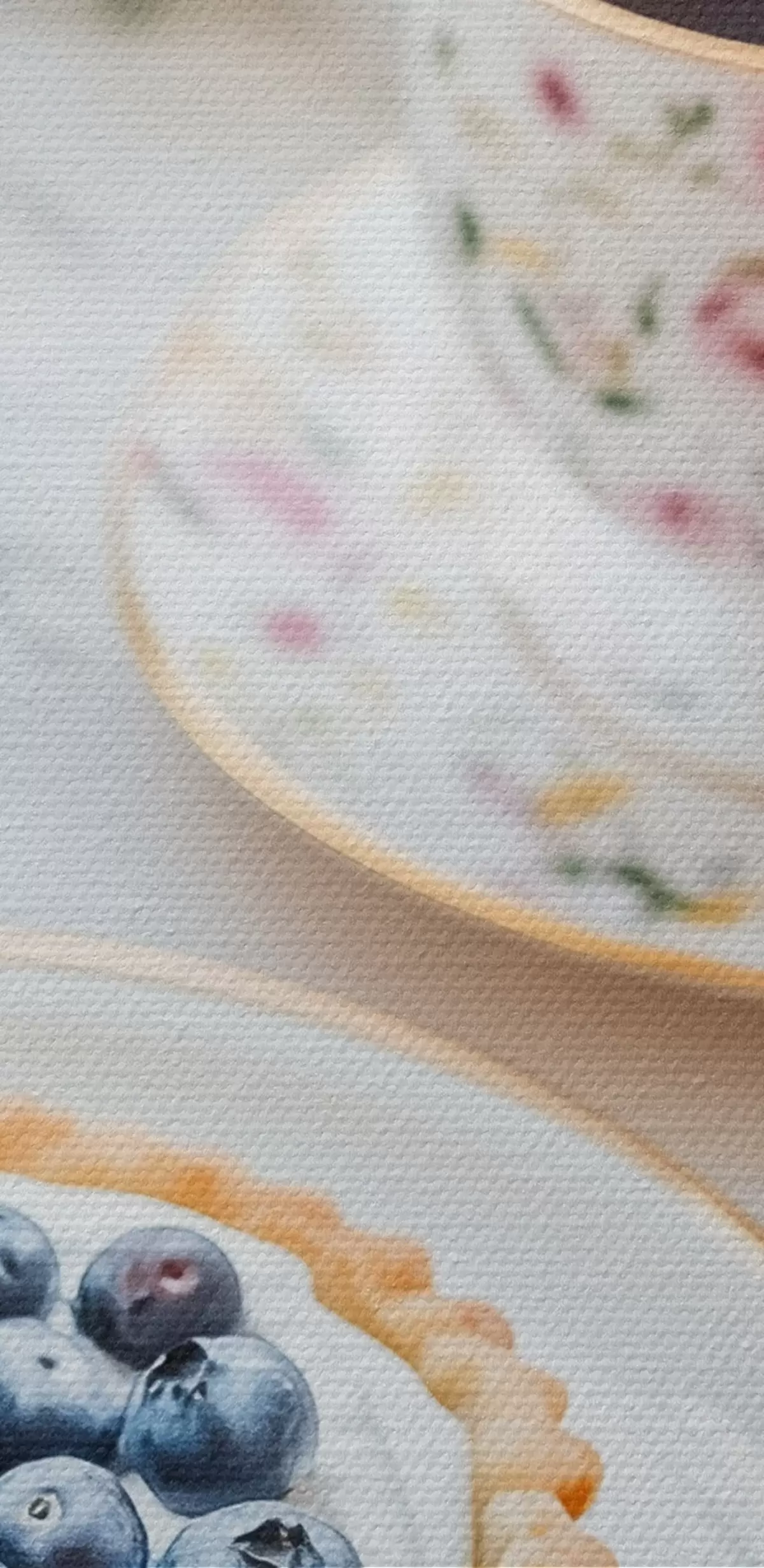 Vászonkép Áfonyás cupcake egy csésze teával, boho stílusban, rózsaszín rózsákkal Nr s43066