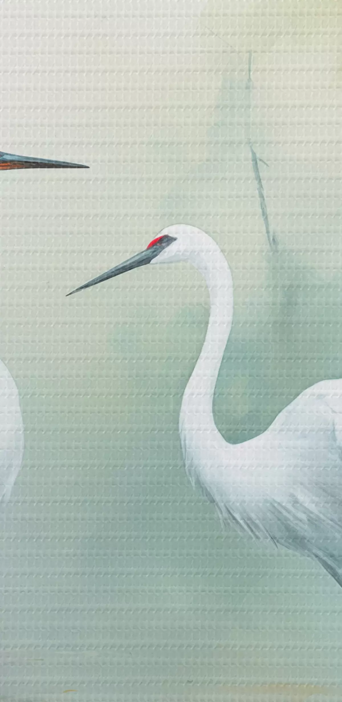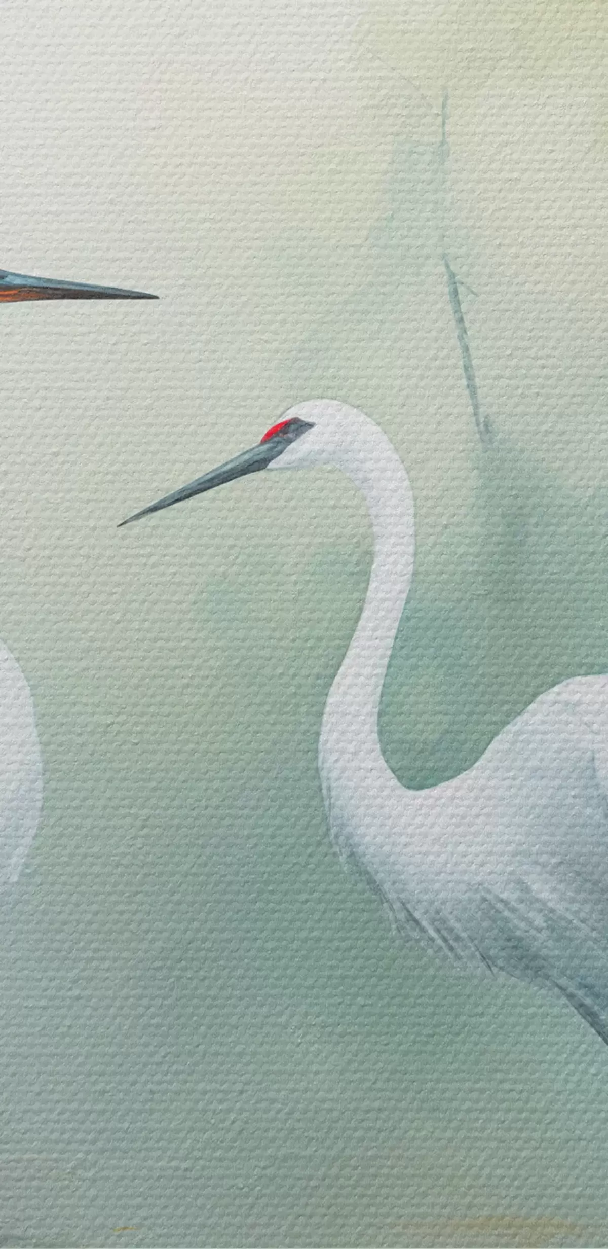 Vászonkép Két fehér daru áll egy tóban , körülvéve egy buja zöld erdővel, lágy, szórt megvilágítással Nr s43166