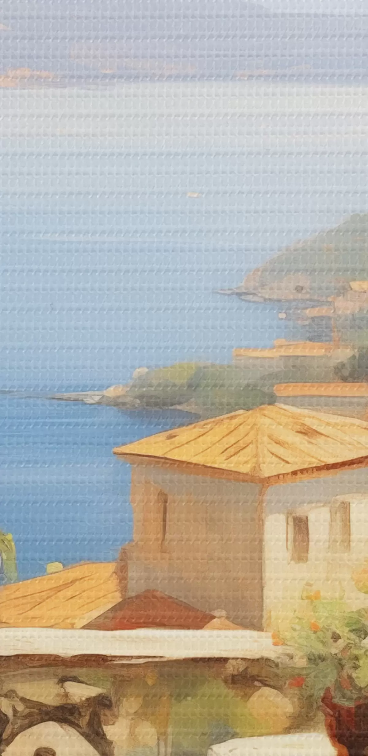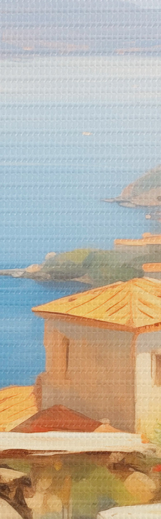 Vászonkép Olajfestmény utánzata erkély virágokkal, kilátással a tengerre, házak a tengerparton, napsütéses nap, kék ég Nr s43173