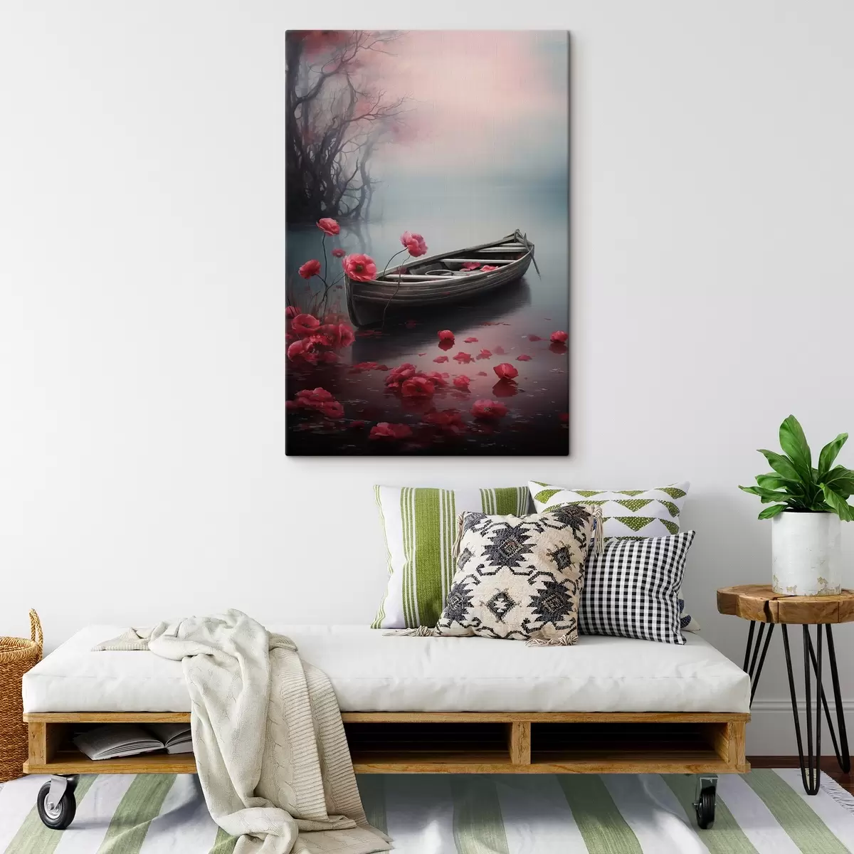 Vászonkép Csónak és mákvirágok a tavon Nr s43203