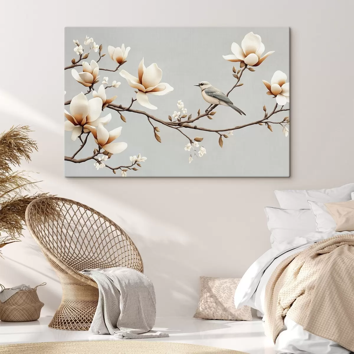 Vászonkép Madár egy ágon magnóliákkal lágy pasztell színekben Nr s43320