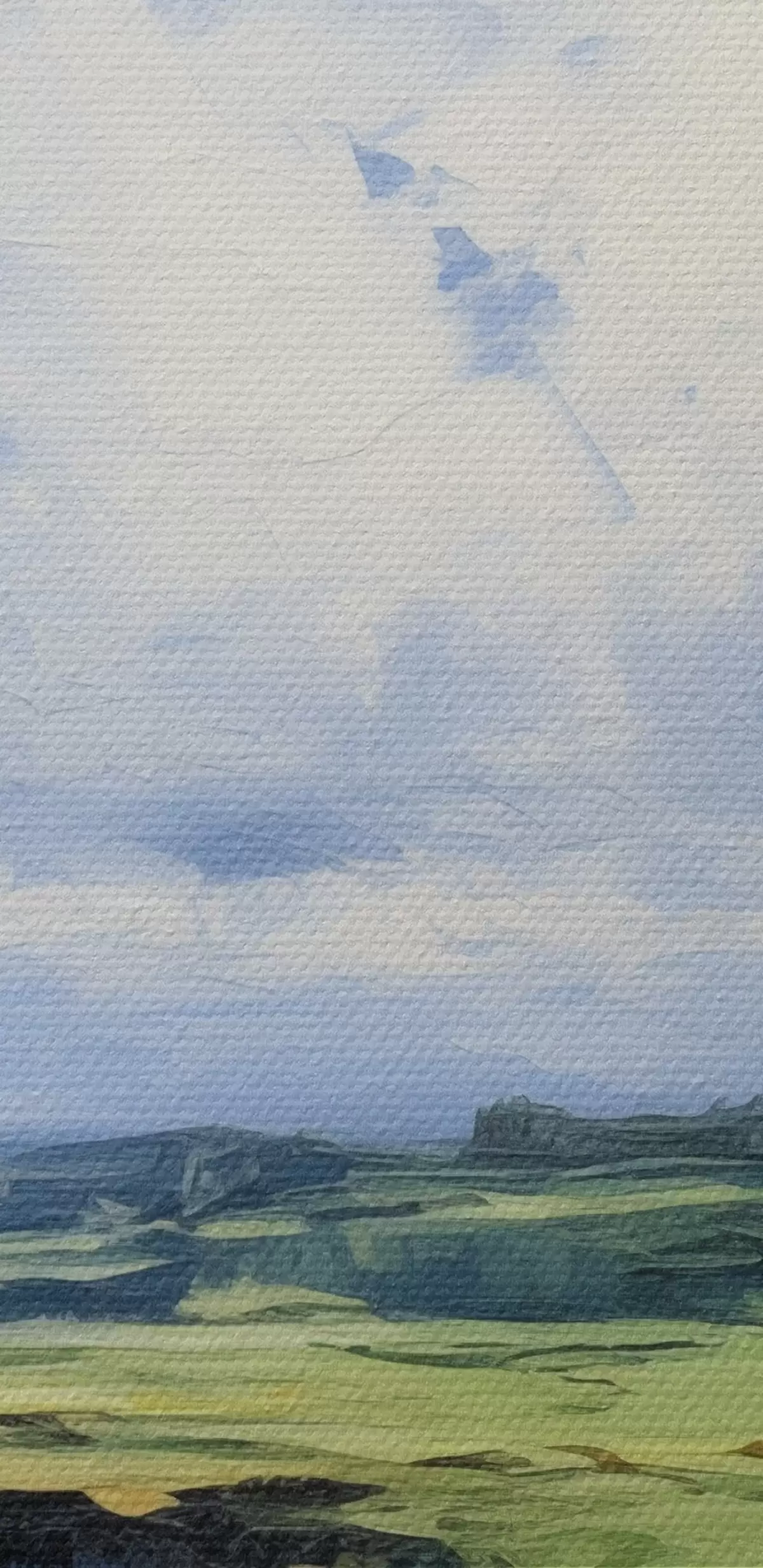 Vászonkép Zöld mező egy szikla a tengerparton, kék tenger hullámokkal, felhős égbolt, minimalista modern olajfestmény utánzás Nr s43406
