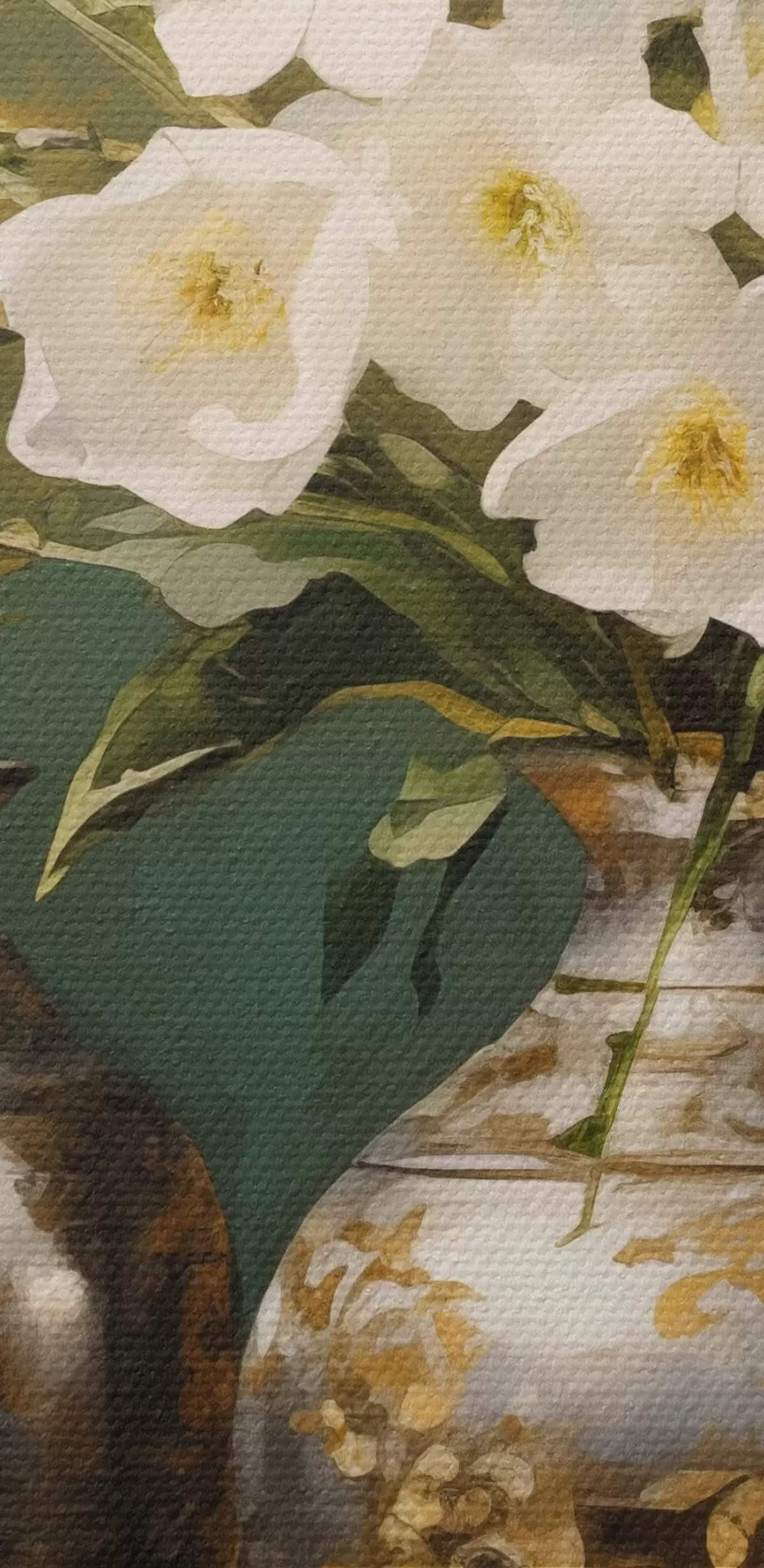 Vászonkép Csendélet fehér virágokkal vázában, díszes vázákkal és tállal zöld asztalon, sötétzöld háttérrel Nr s43408