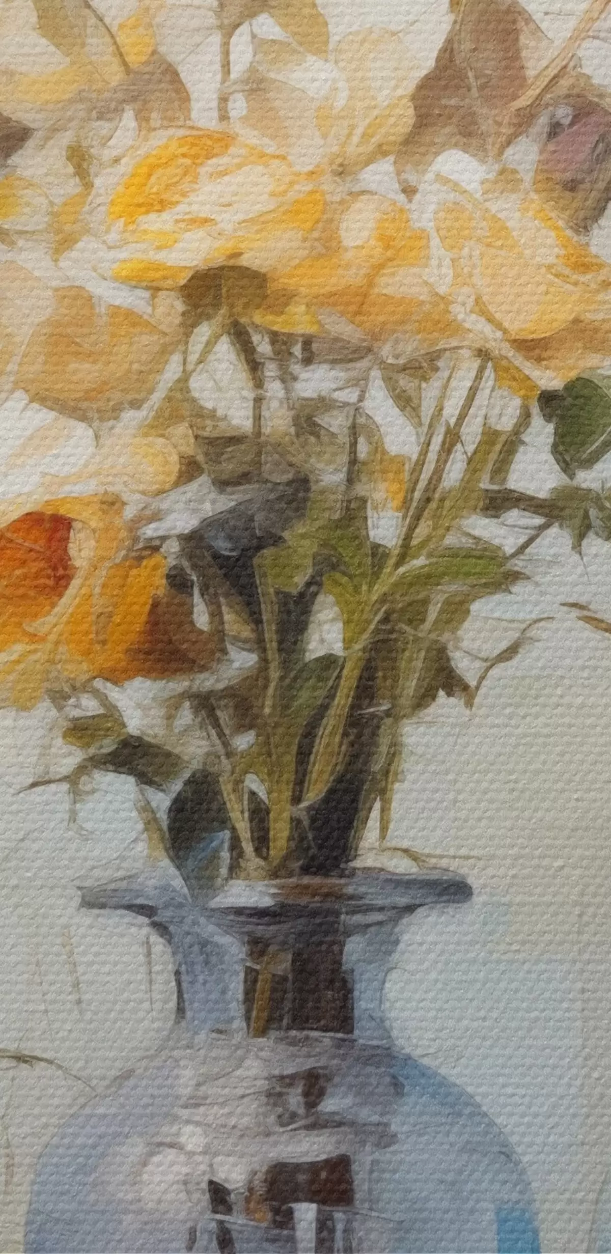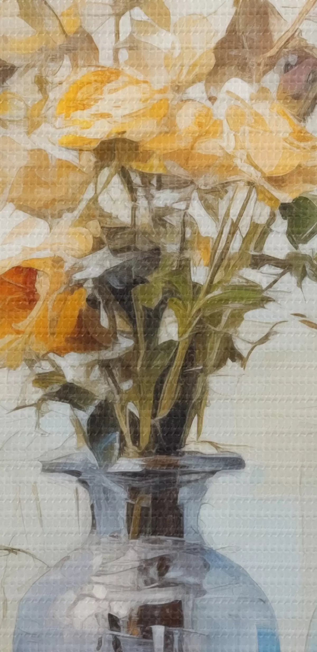Vászonkép Sárga rózsák csendélete kék üvegvázában, könnyű textúrájú háttér, lágy ecsetvonások, olajfestmény stílusban Nr s43409