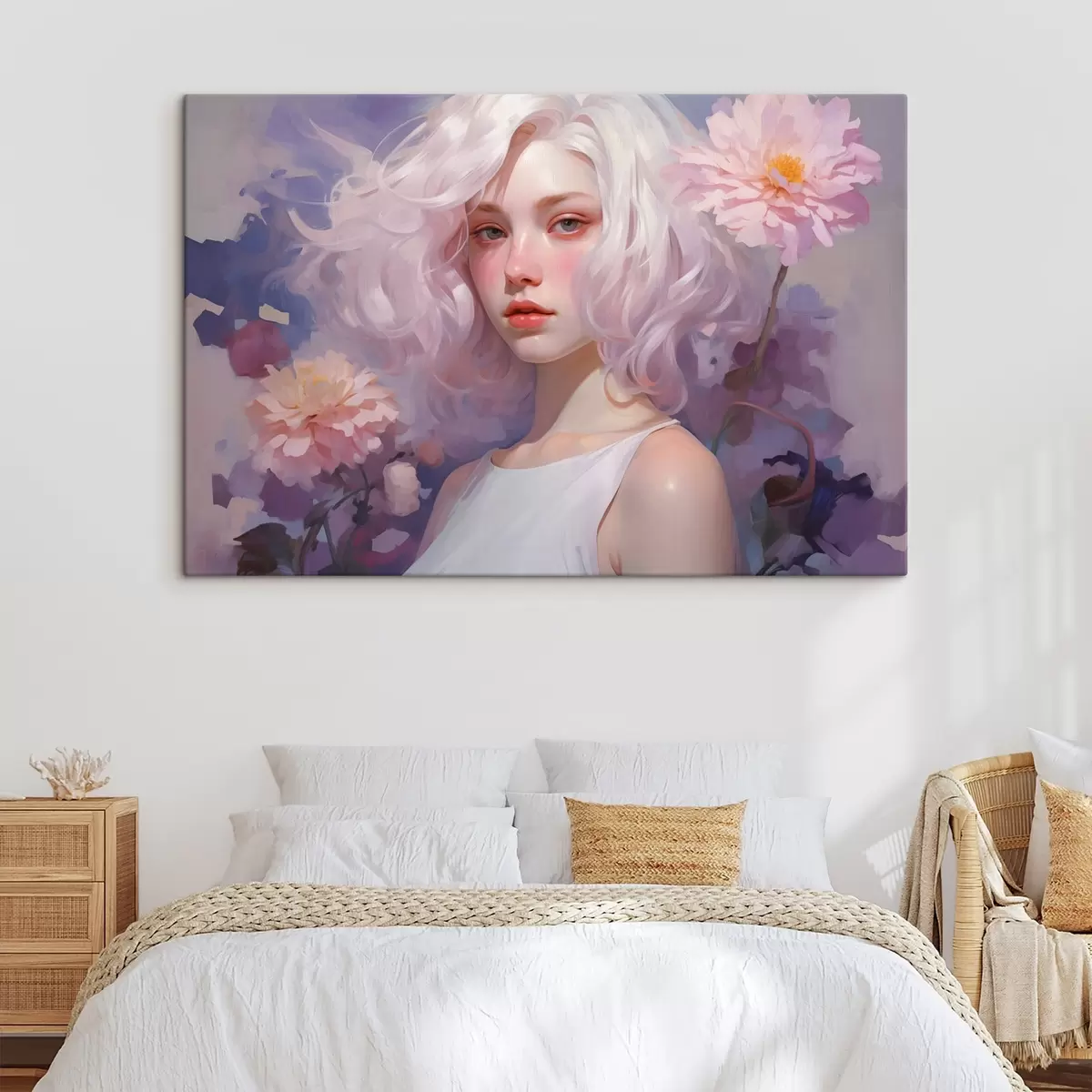 Vászonkép Gyönyörű lány a virágok között, akril stílusú rajz, Japán, lila színek Nr s43495
