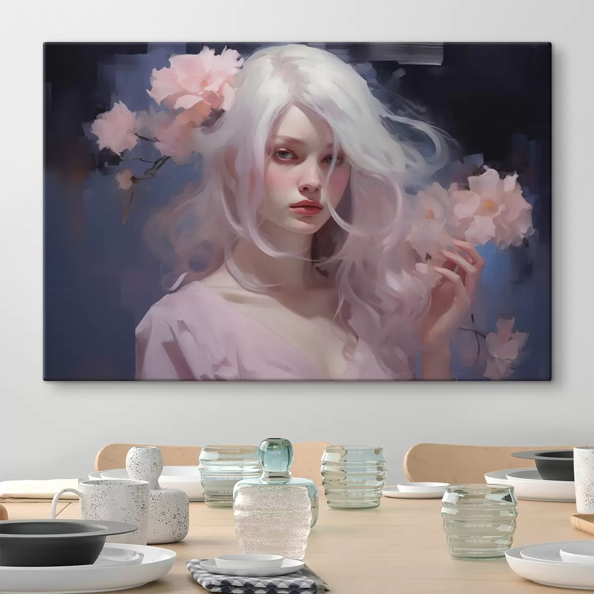 Vászonkép Lány bazsarózsákkal, akril stílusú rajz, sötét háttér Nr s43496