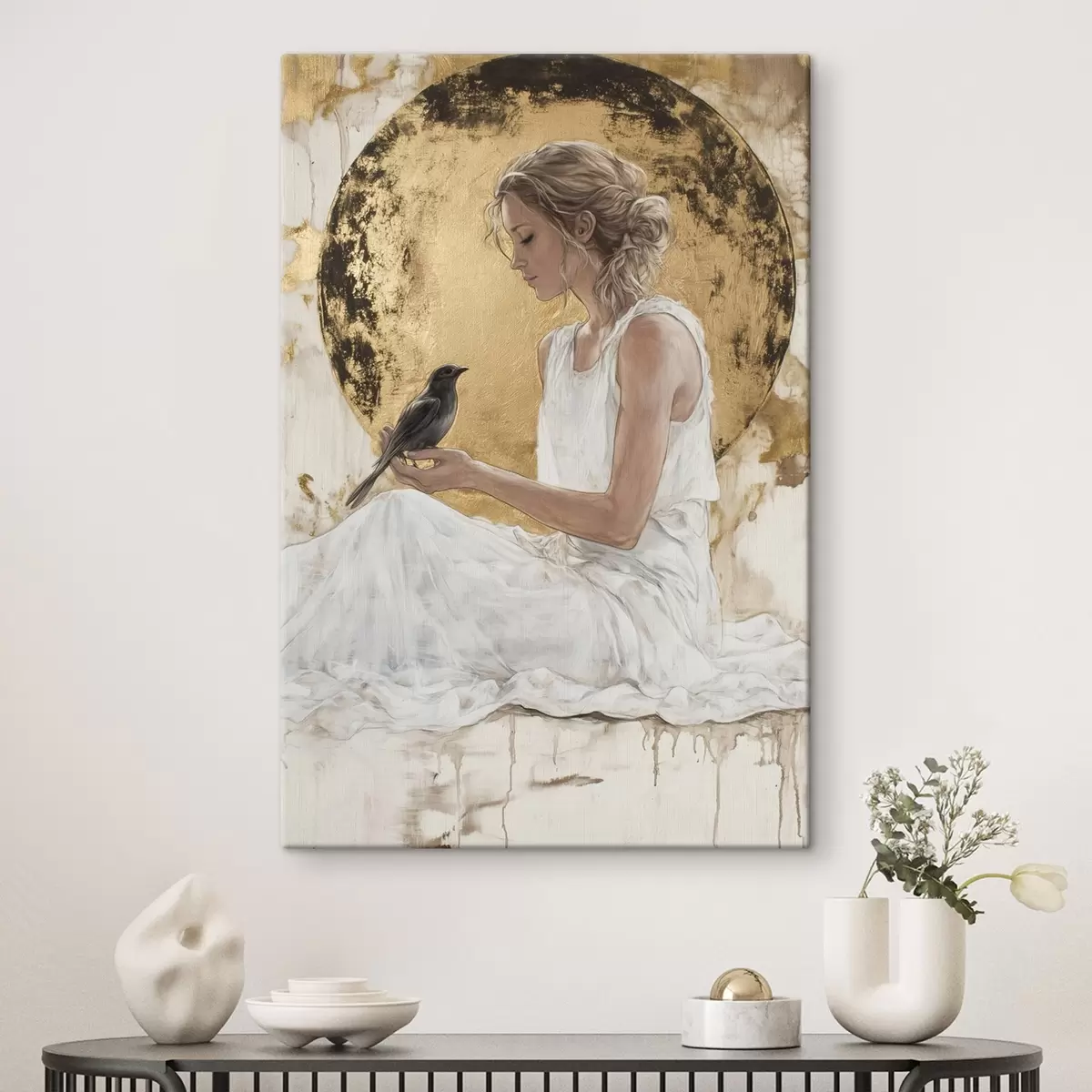 Vászonkép Gyönyörű nő madárral, Görögország, akril stílusú rajz Nr s43503