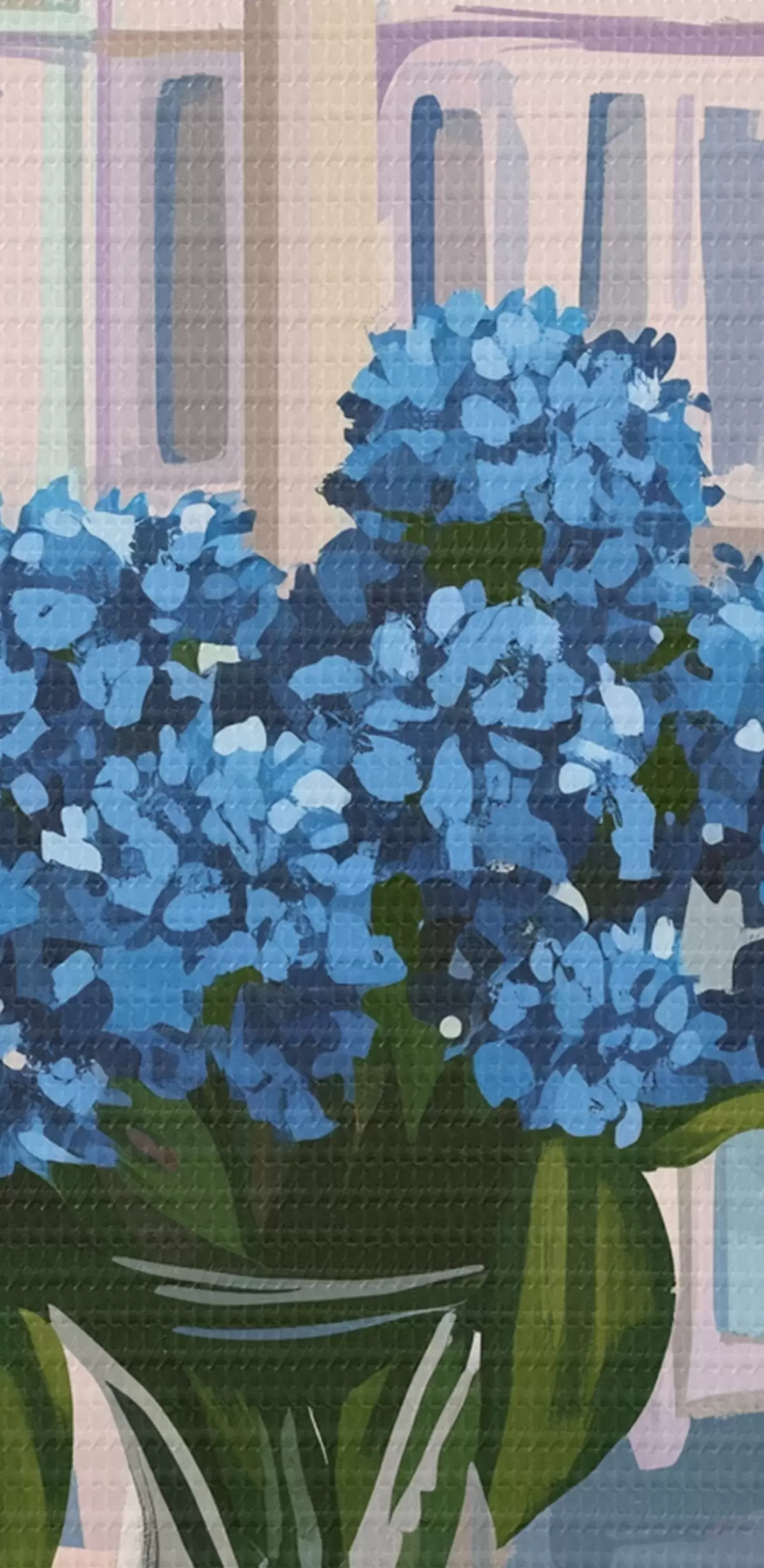Vászonkép Hortenziák a vázában, ablaknézet, gyertya, hangulatos otthon Nr s44009