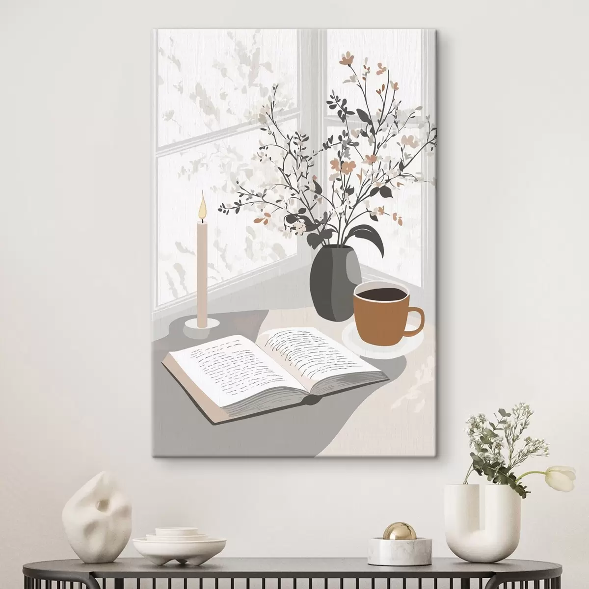 Vászonkép Absztrakció, nyitott könyv, váza virágokkal, gyertya, bézs színek Nr s44011