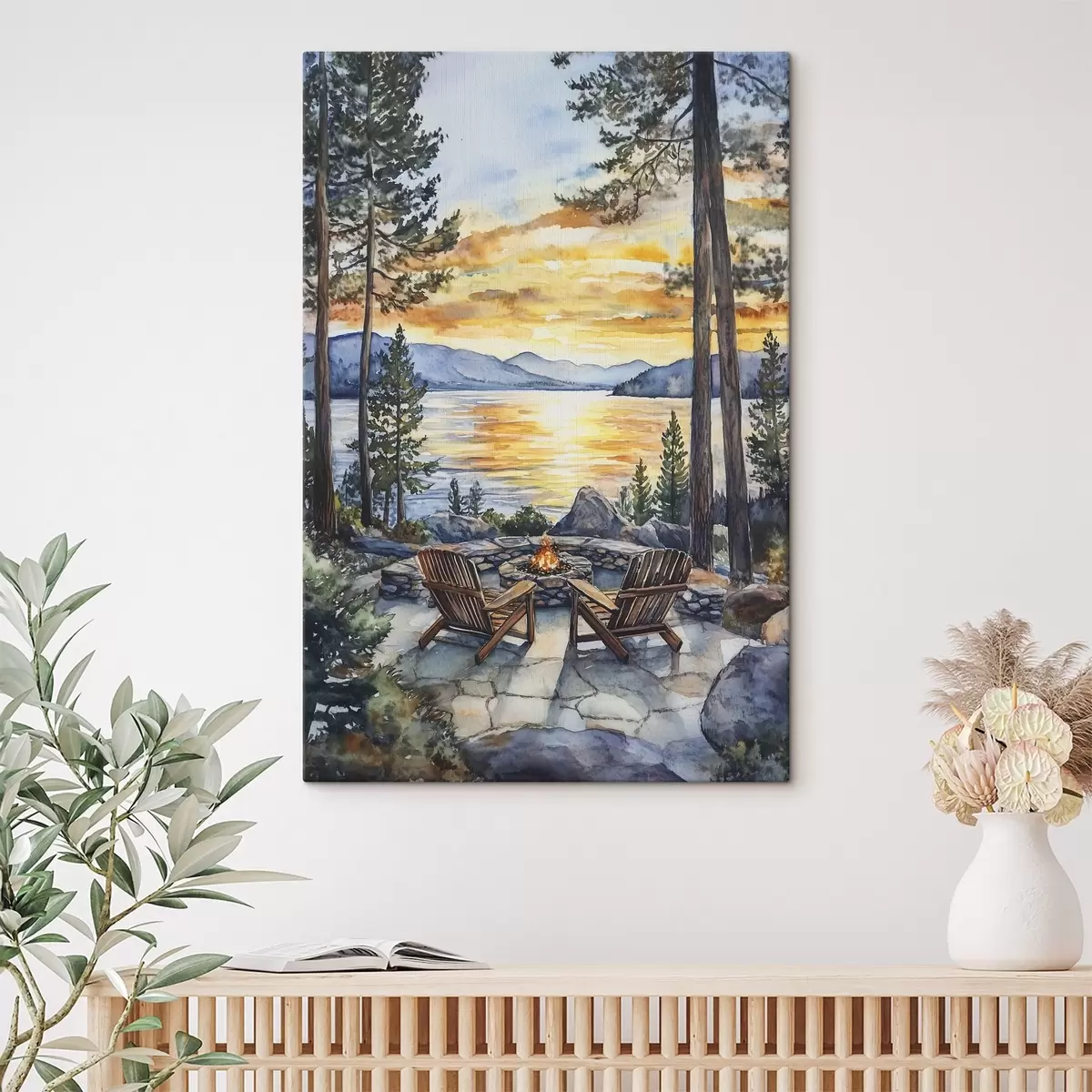 Vászonkép Tó hegyekkel a naplementében, utazás, hangulatos kandalló, vízfestmény Nr s44018