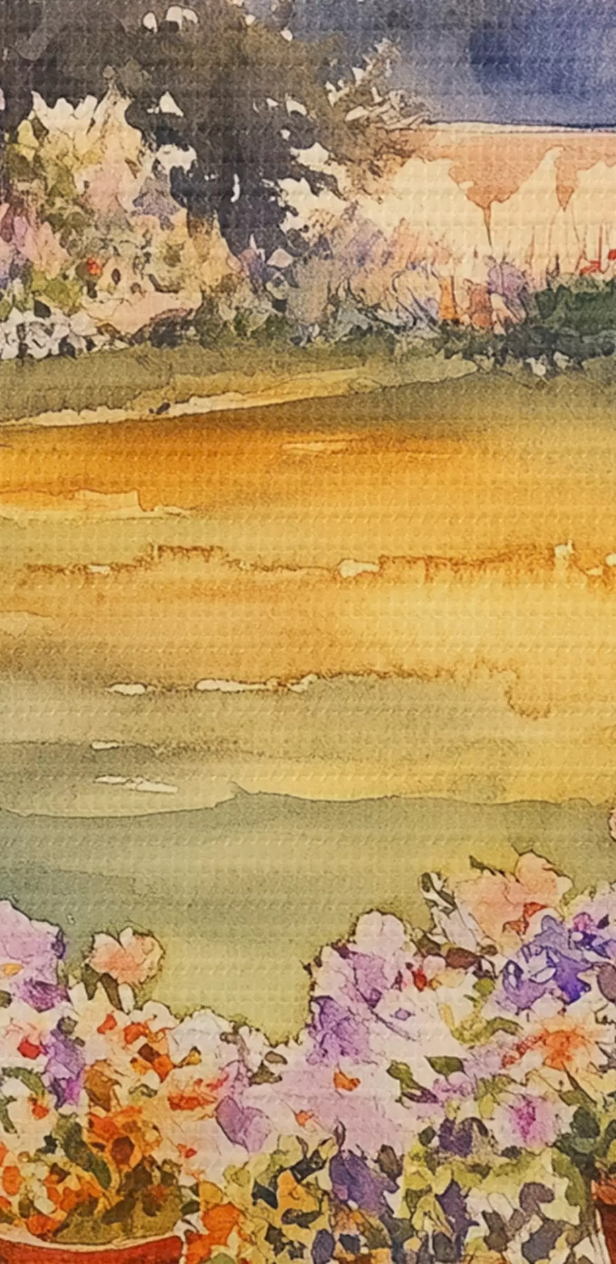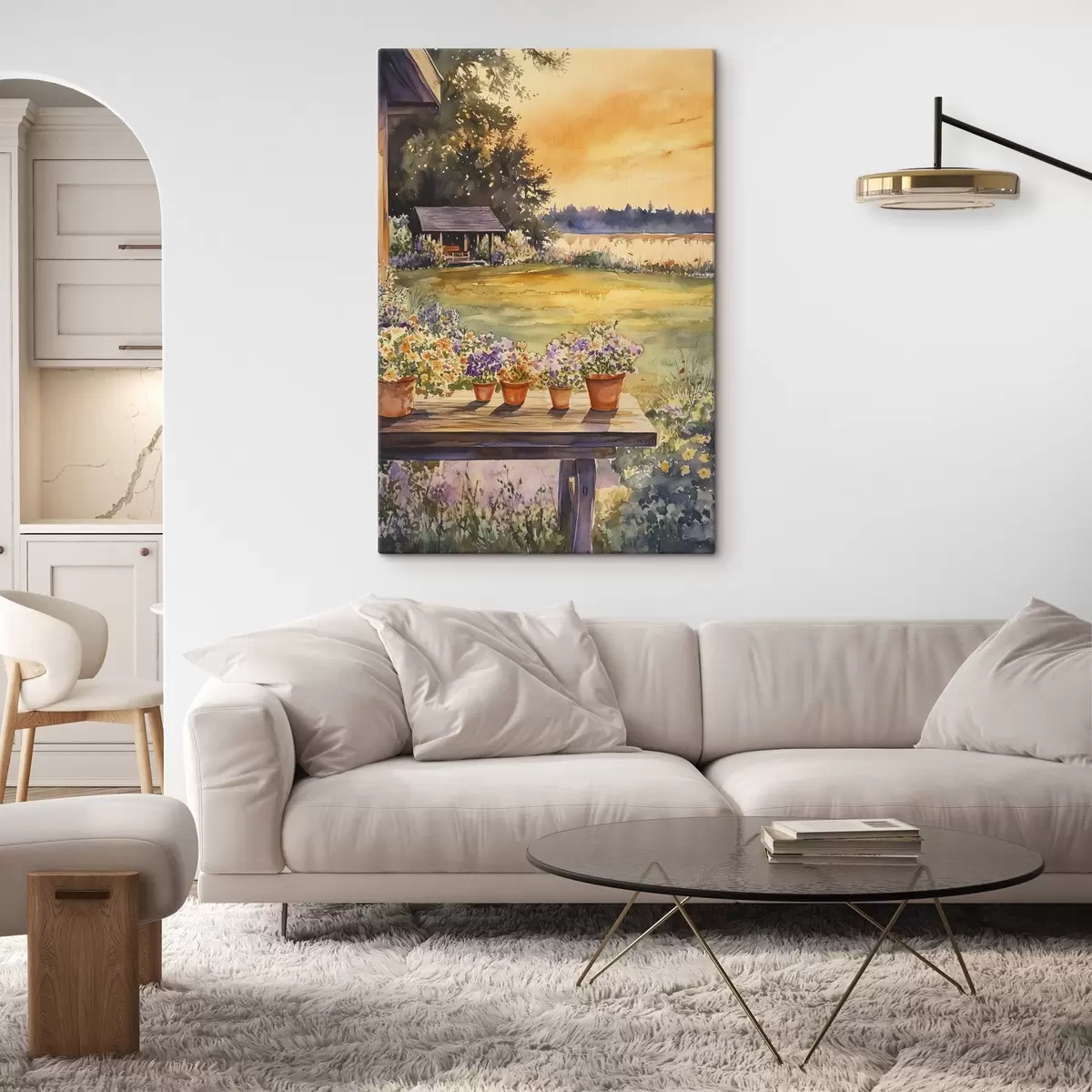 Vászonkép Virágok a falu kertjében, naplemente színek, akvarell stílusban Nr s44019