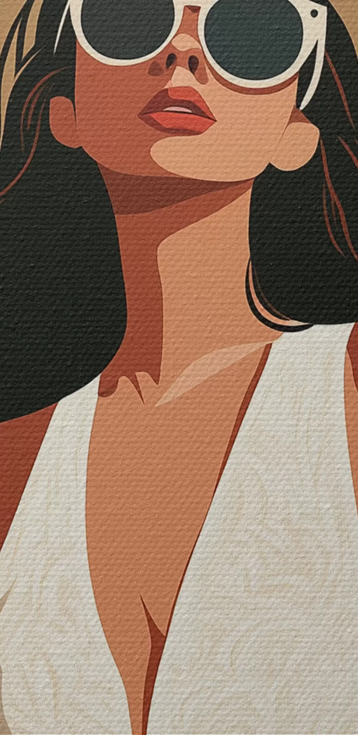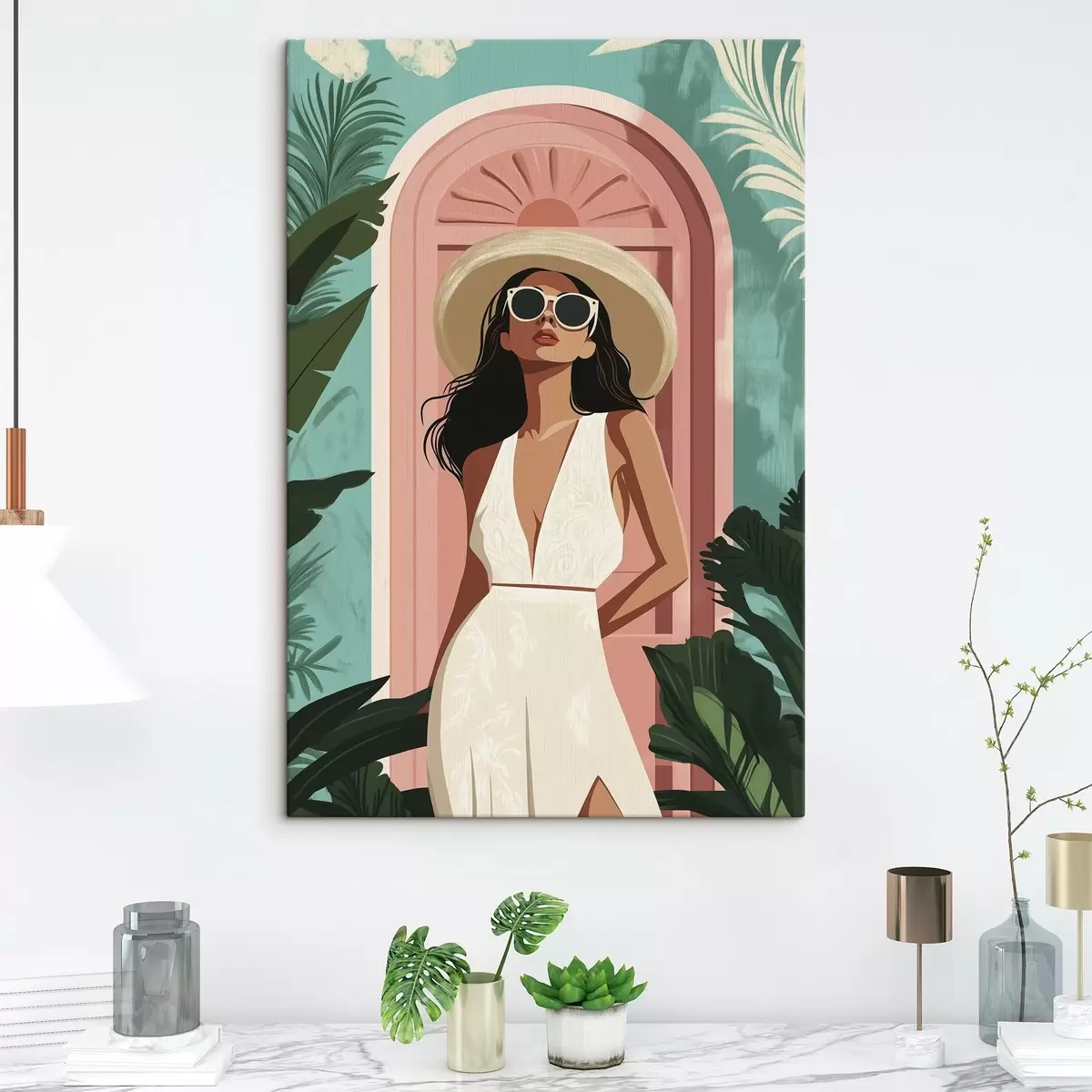 Vászonkép Nő napszemüvegben és kalapban, trópusi természet, építészet Nr s44152