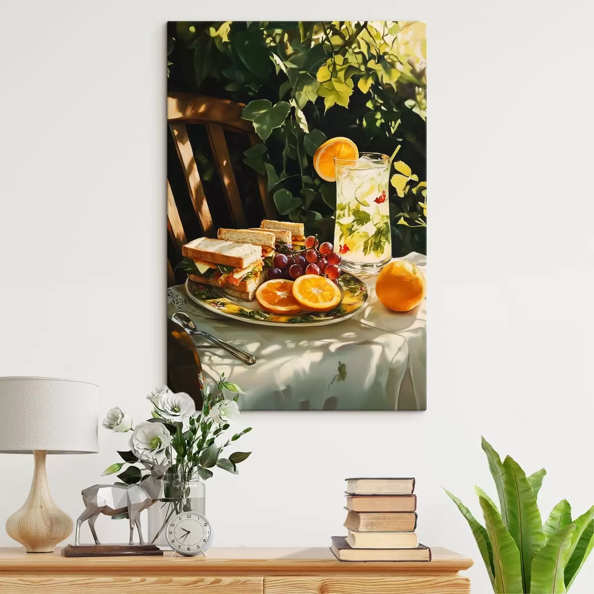 Vászonkép Esztétikus piknik a nyári kertben, szendvicsek, narancs, limonádé Nr s44306