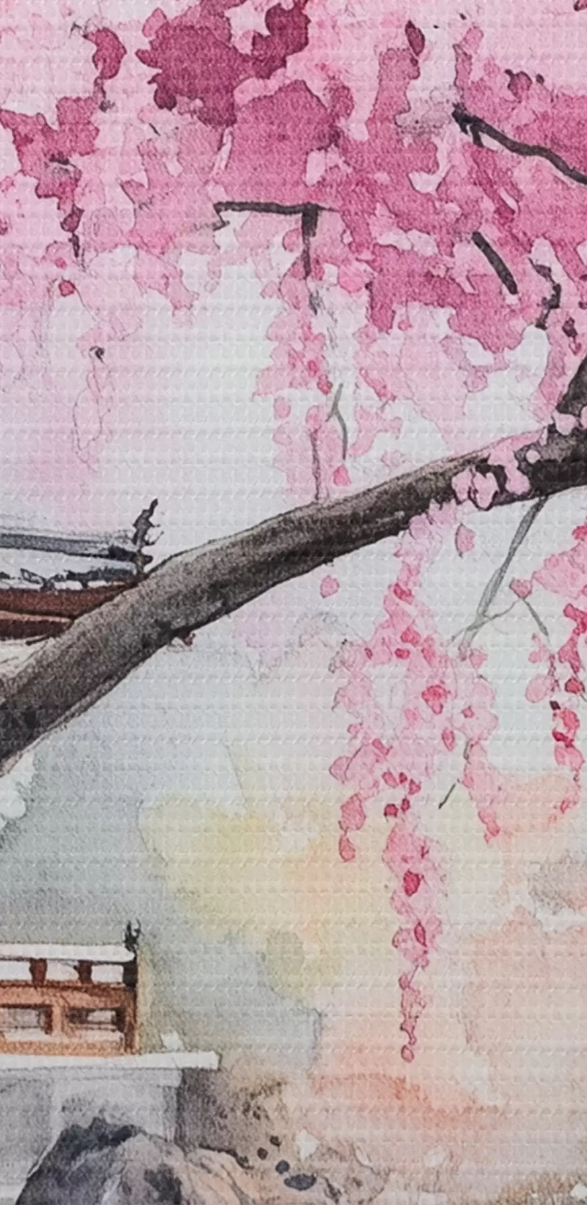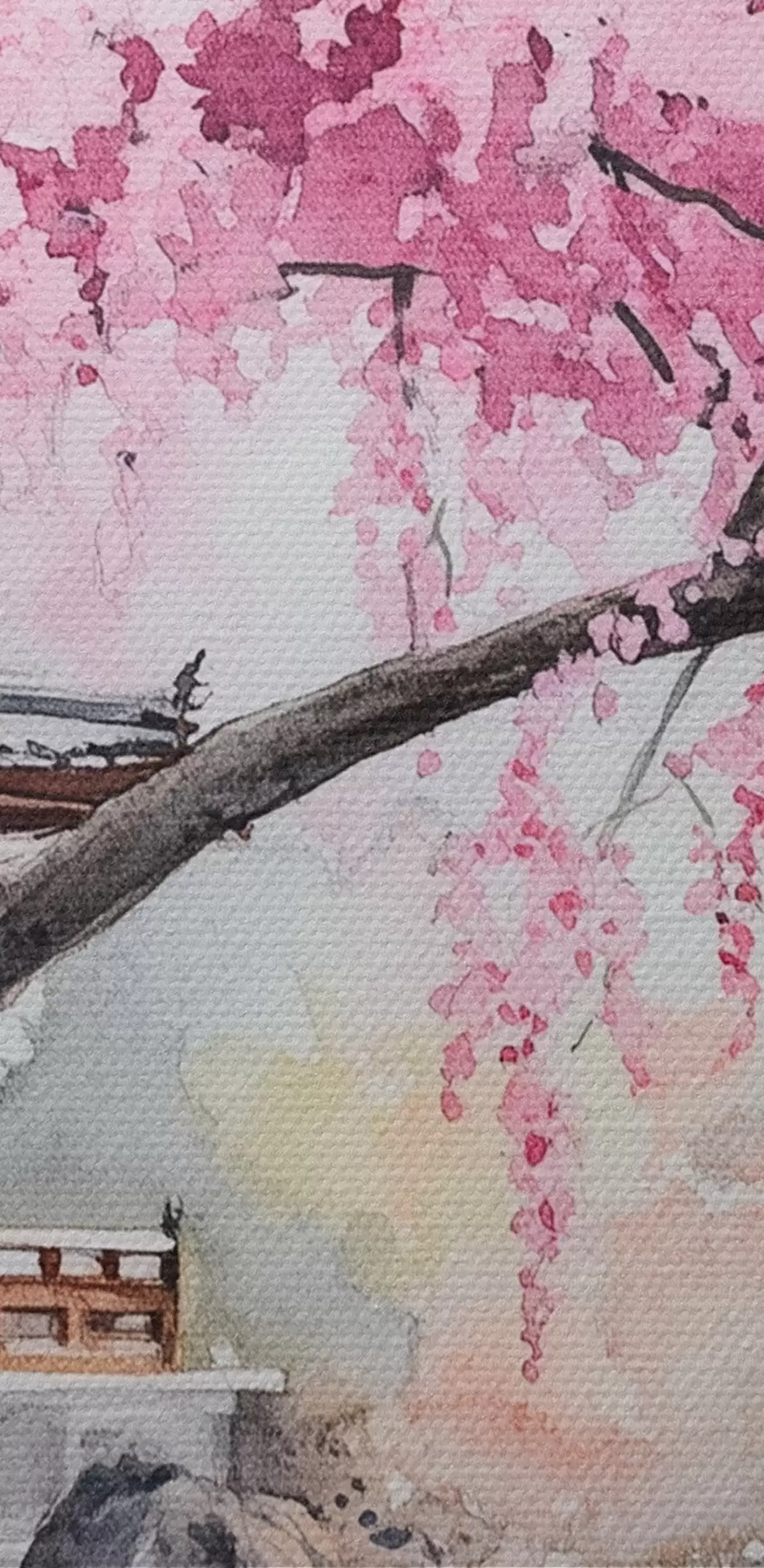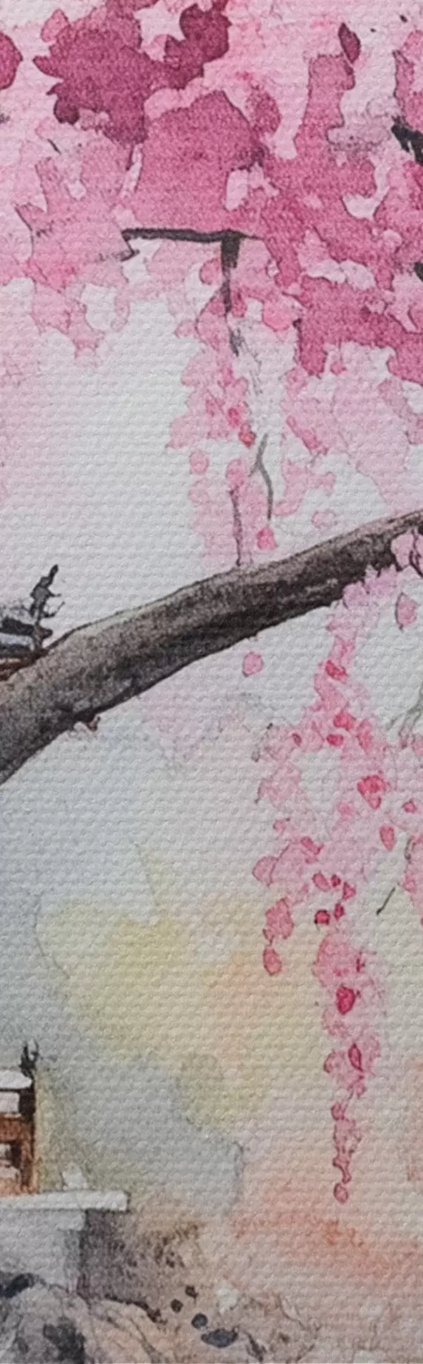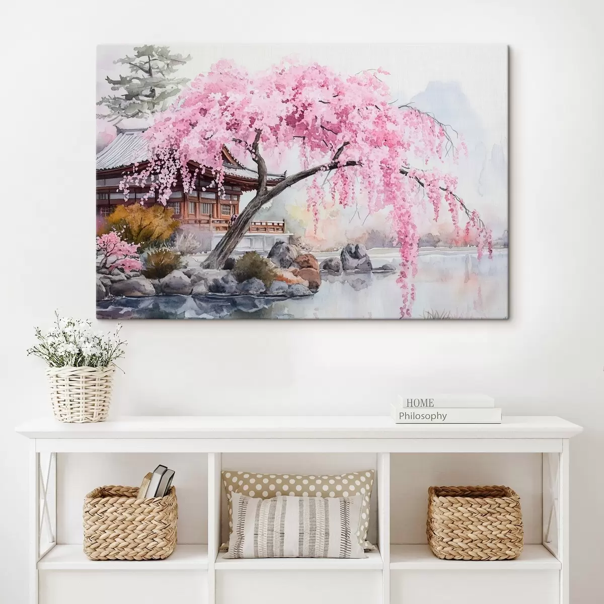 Vászonkép Rózsaszín cseresznyefa a tóparti ház mellett, Japán, keleti, akvarell stílusban Nr s44312