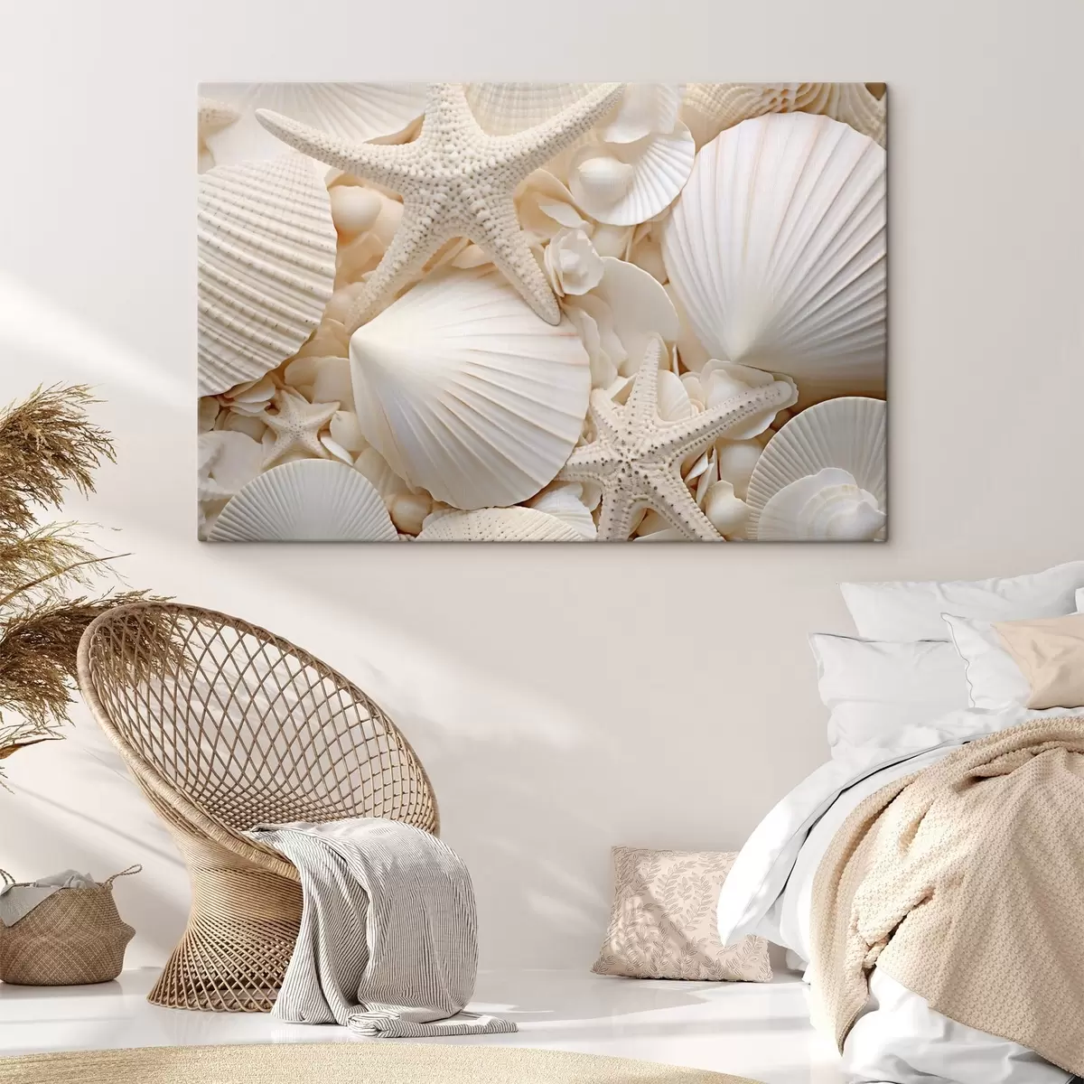 Vászonkép Dekoratív fehér kagylók és tengeri csillagok, amelyek texturált monokróm kompozíciót hoznak létre Nr s44392
