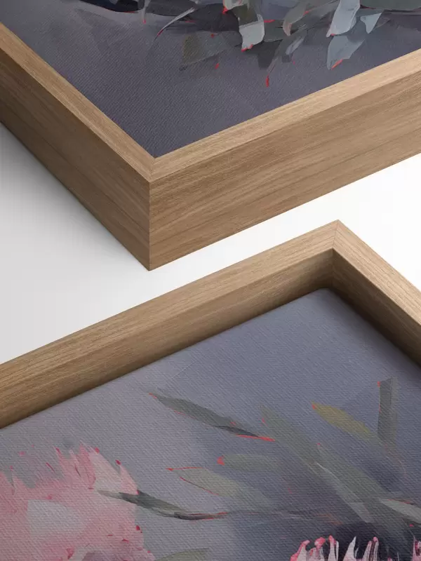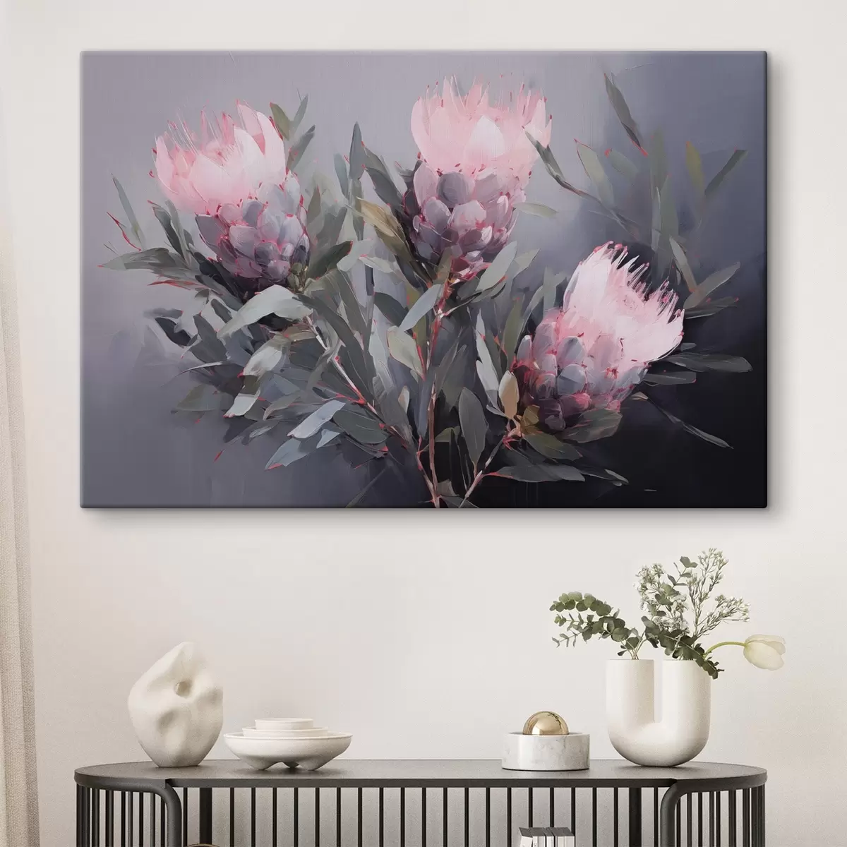 Vászonkép Rózsaszín protea virágok zöld levelekkel, lágy ecsetvonások, sötét színek, elegáns kompozíció Nr s44400