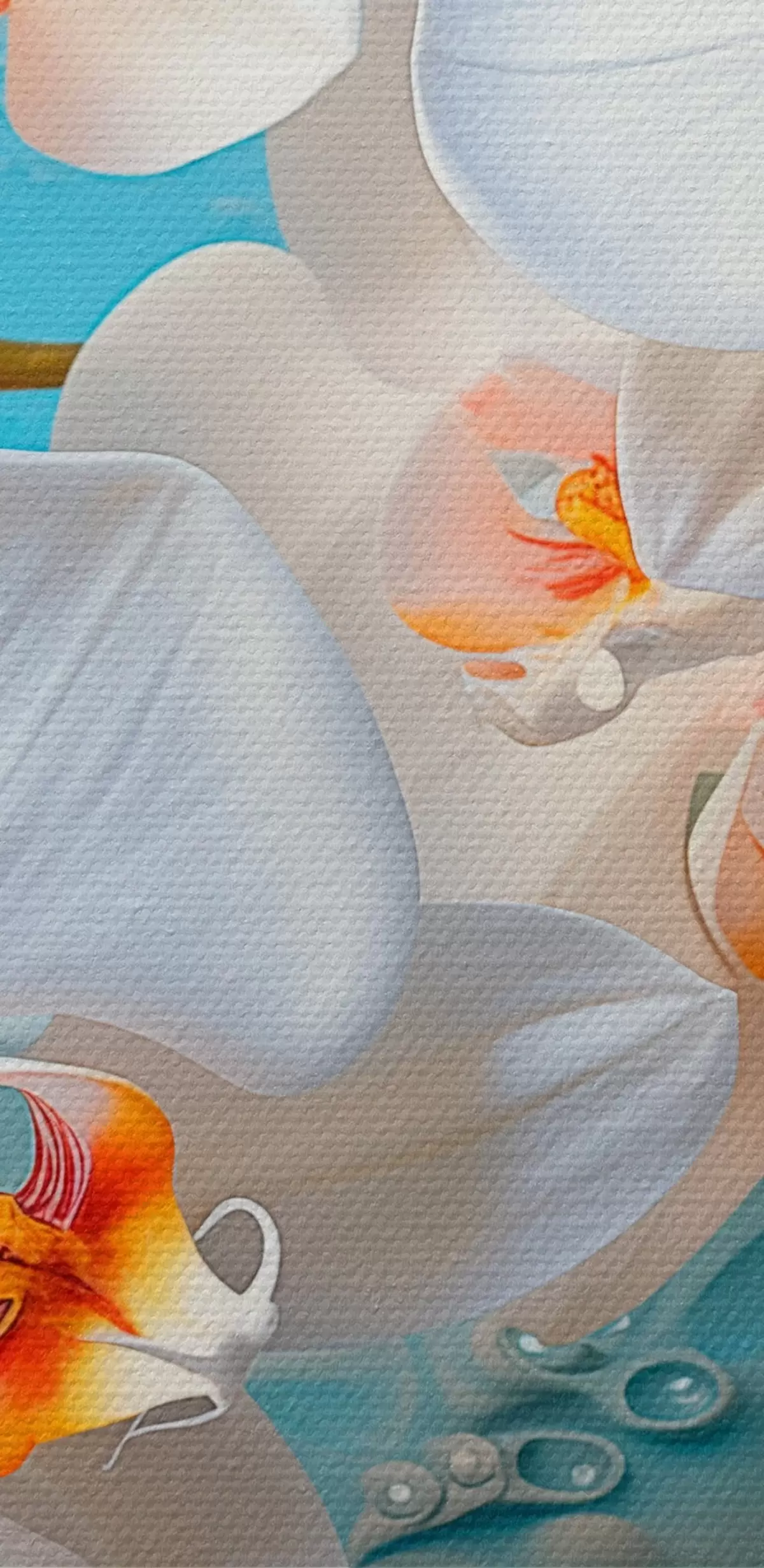 Vászonkép Fehér orchideák, világoskék felületen elrendezve, vízcseppekkel, lágy megvilágítással Nr s44401