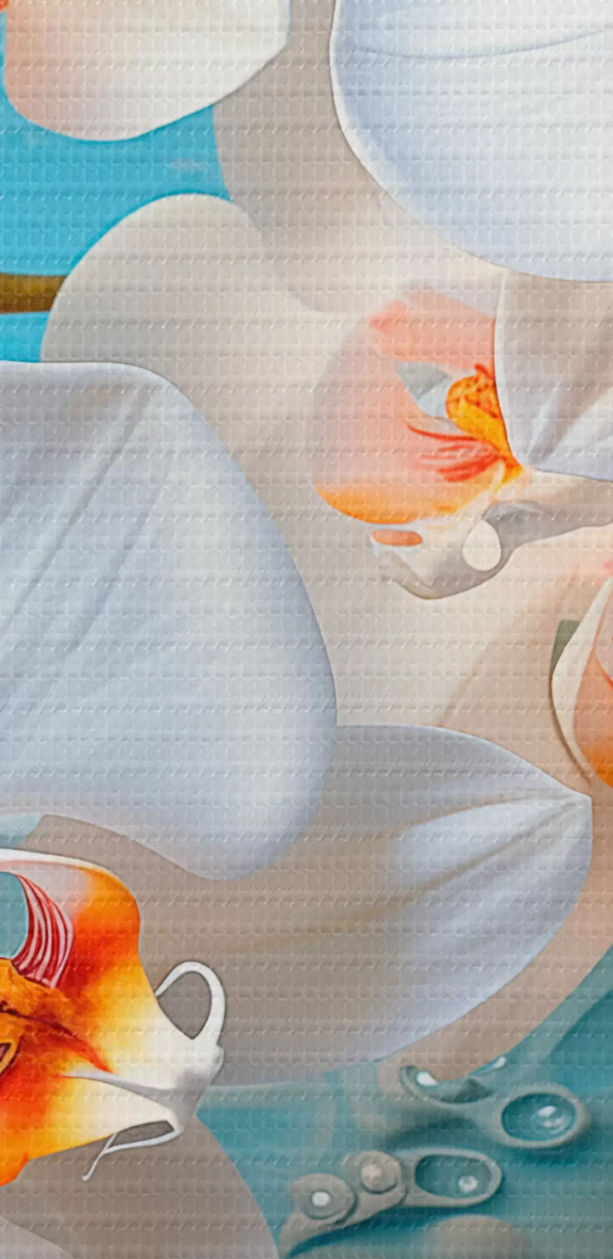 Ahhoz, hogy a vásznat a feszítőrúdra feszítsük anélkül, hogy a kép megsérülne, tükrözött képet használunk.