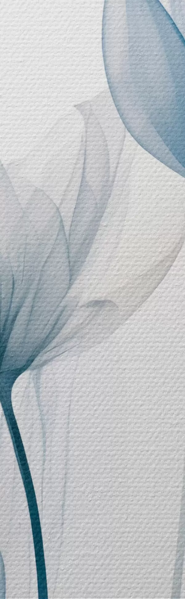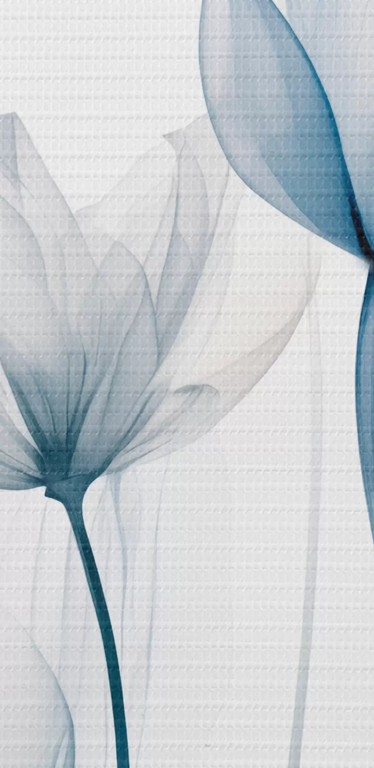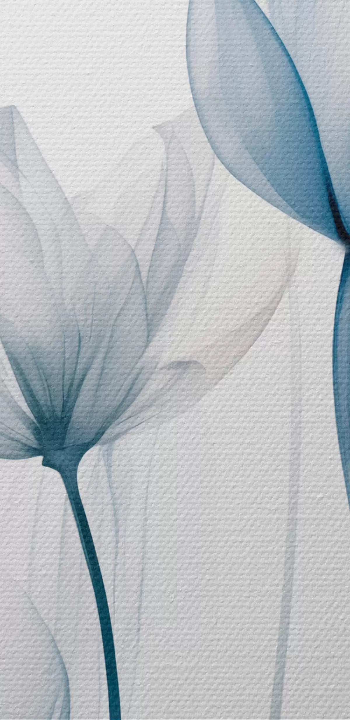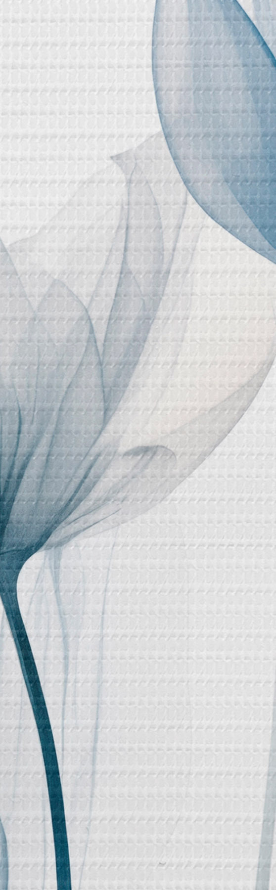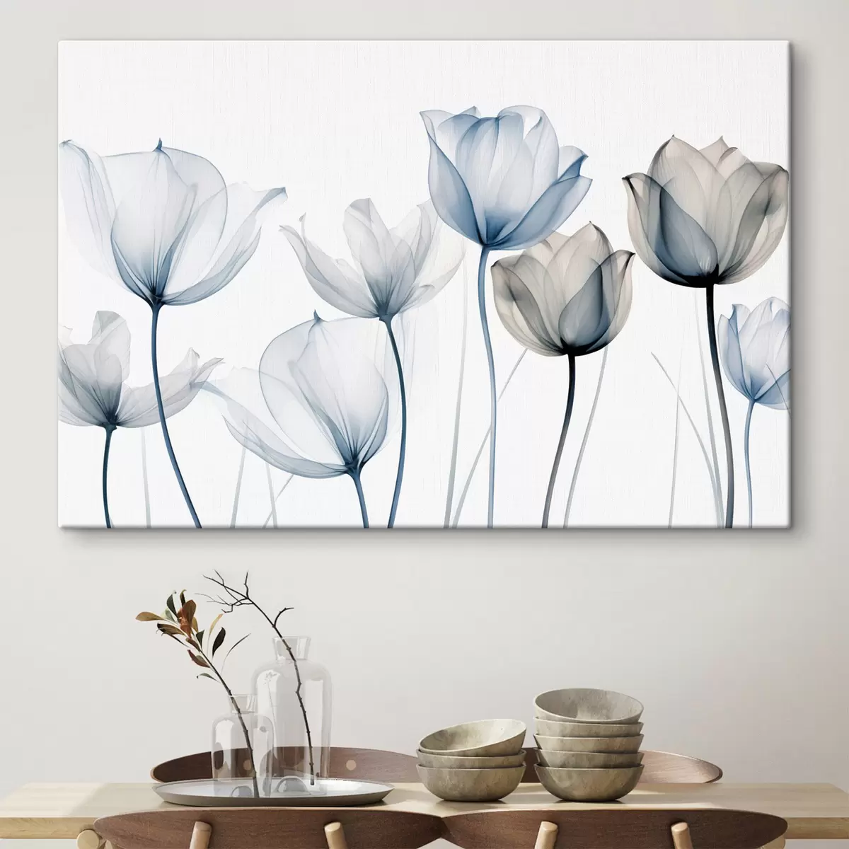 Vászonkép Áttetsző kék és fehér tulipánok hosszú szárakkal, egyszínű fehér háttér előtt Nr s44409