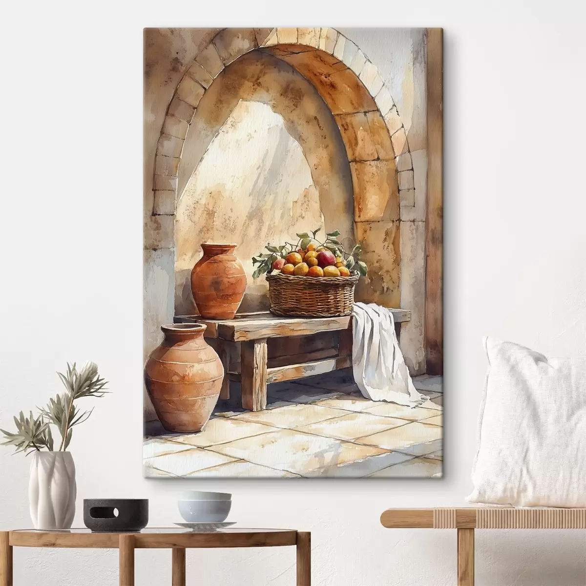 Vászonkép Esztétikus vázák és fonott kosár narancsokkal, Toszkána, rusztikus stílusban Nr s44605