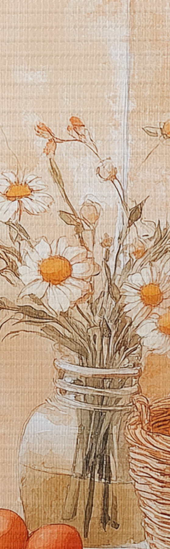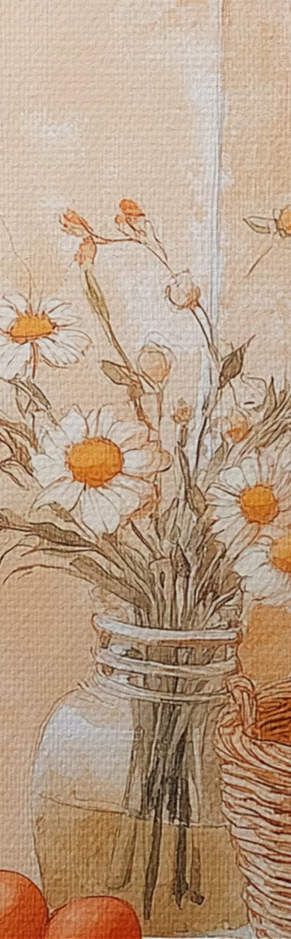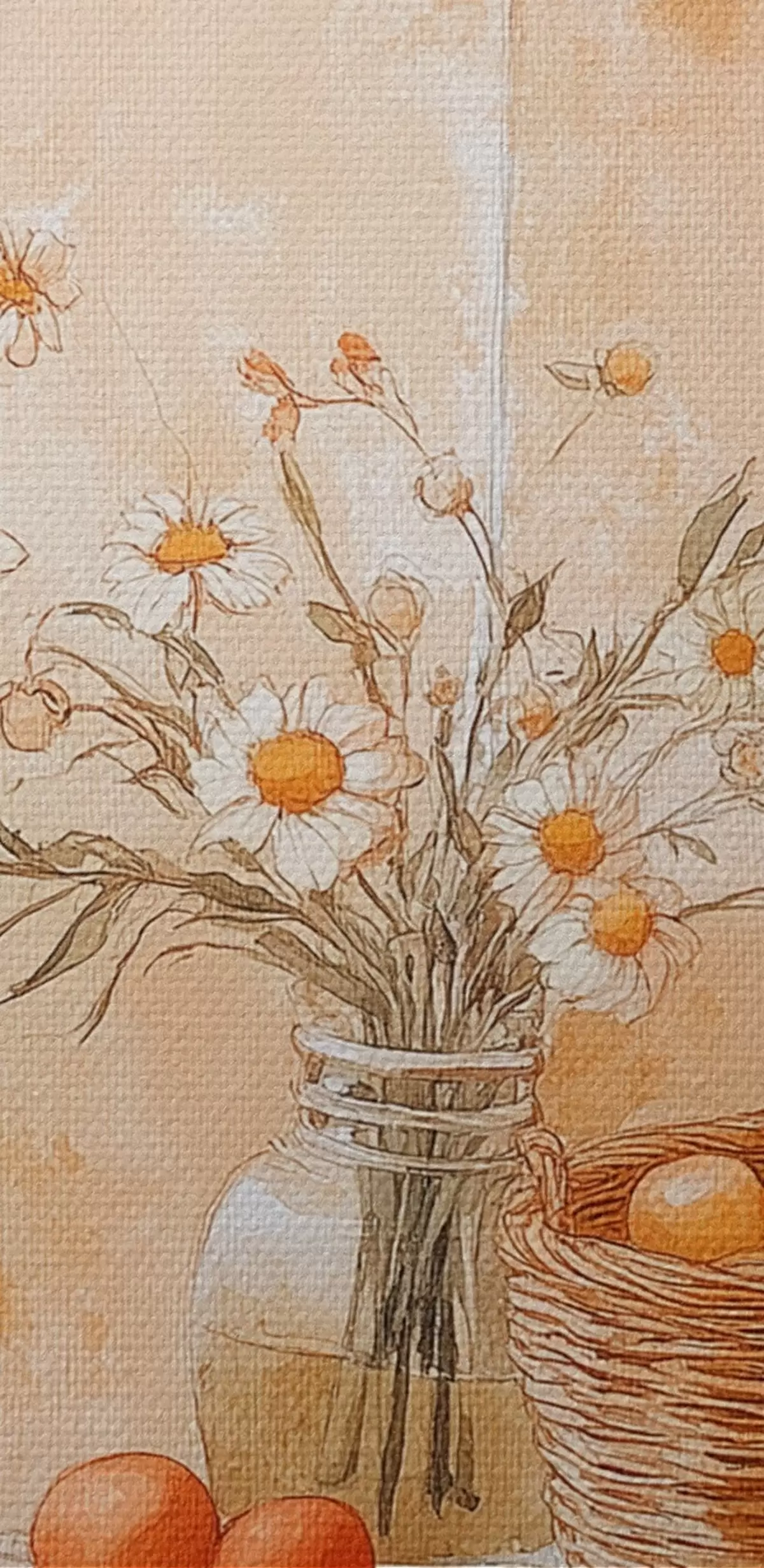 Vászonkép Boltíves fal antik befőttesüveggel, kamillavirággal és narancskosárral Nr s44613