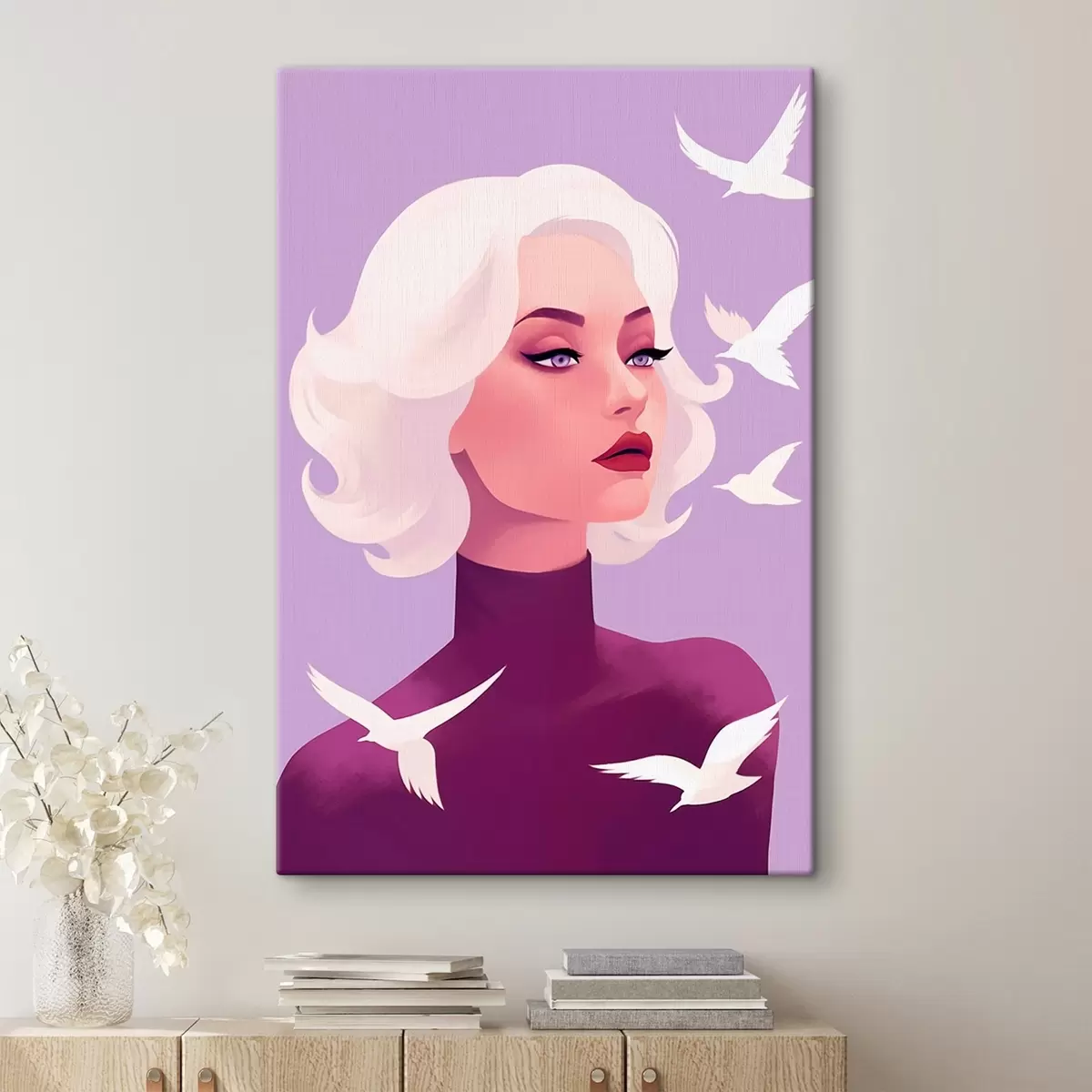 Vászonkép Női portré fehér hajjal a háttérben madarakkal Nr s44681