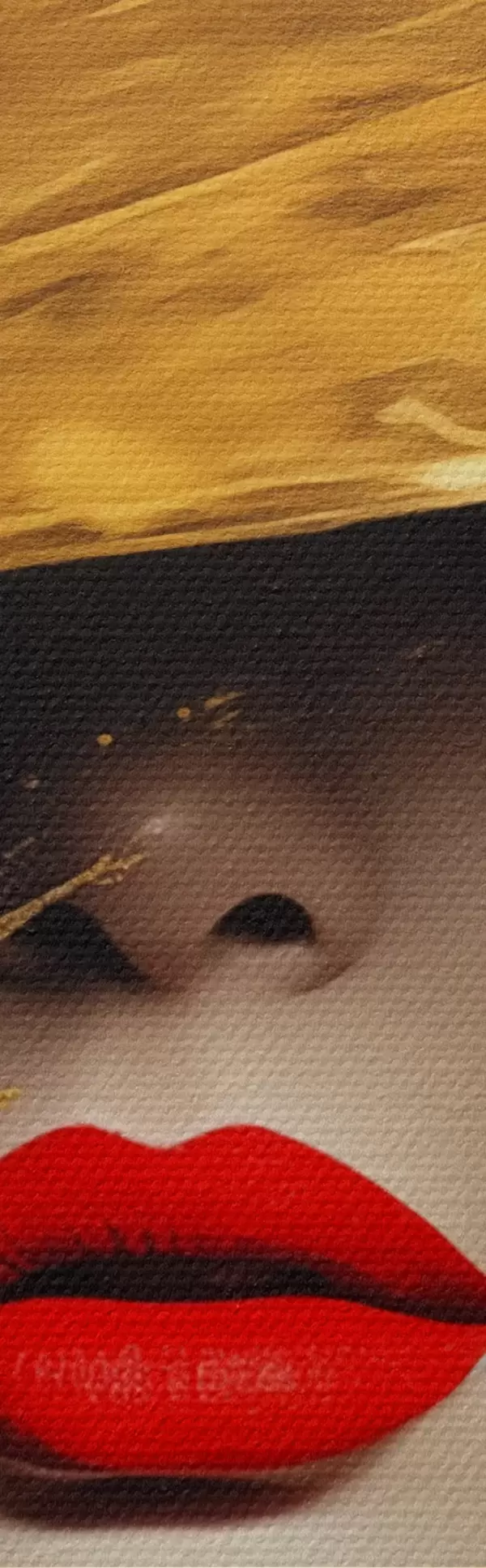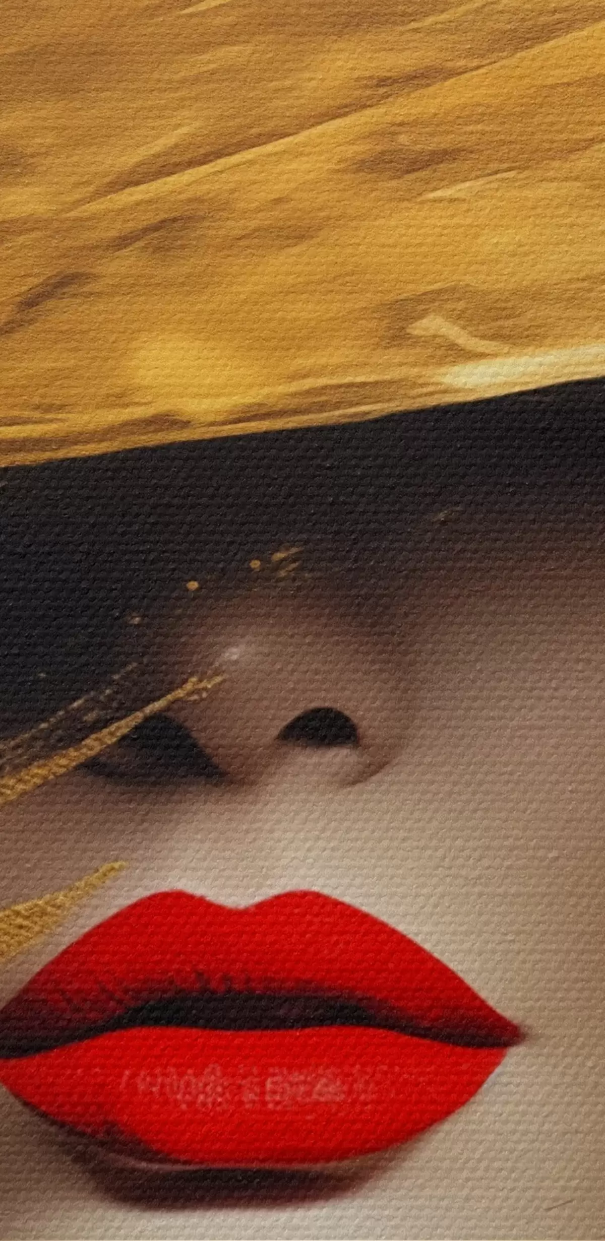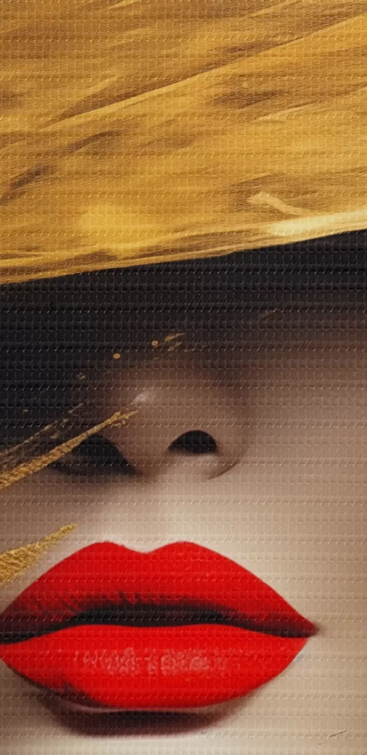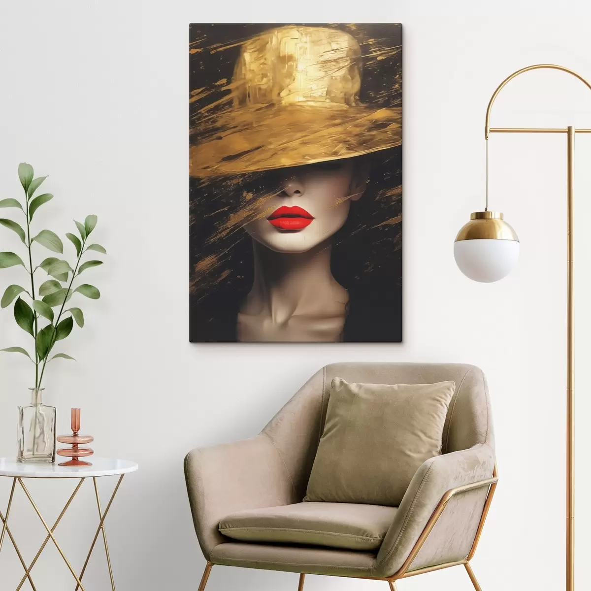 Vászonkép Női arc piros rúzzsal széles kalap alatt Nr s44691