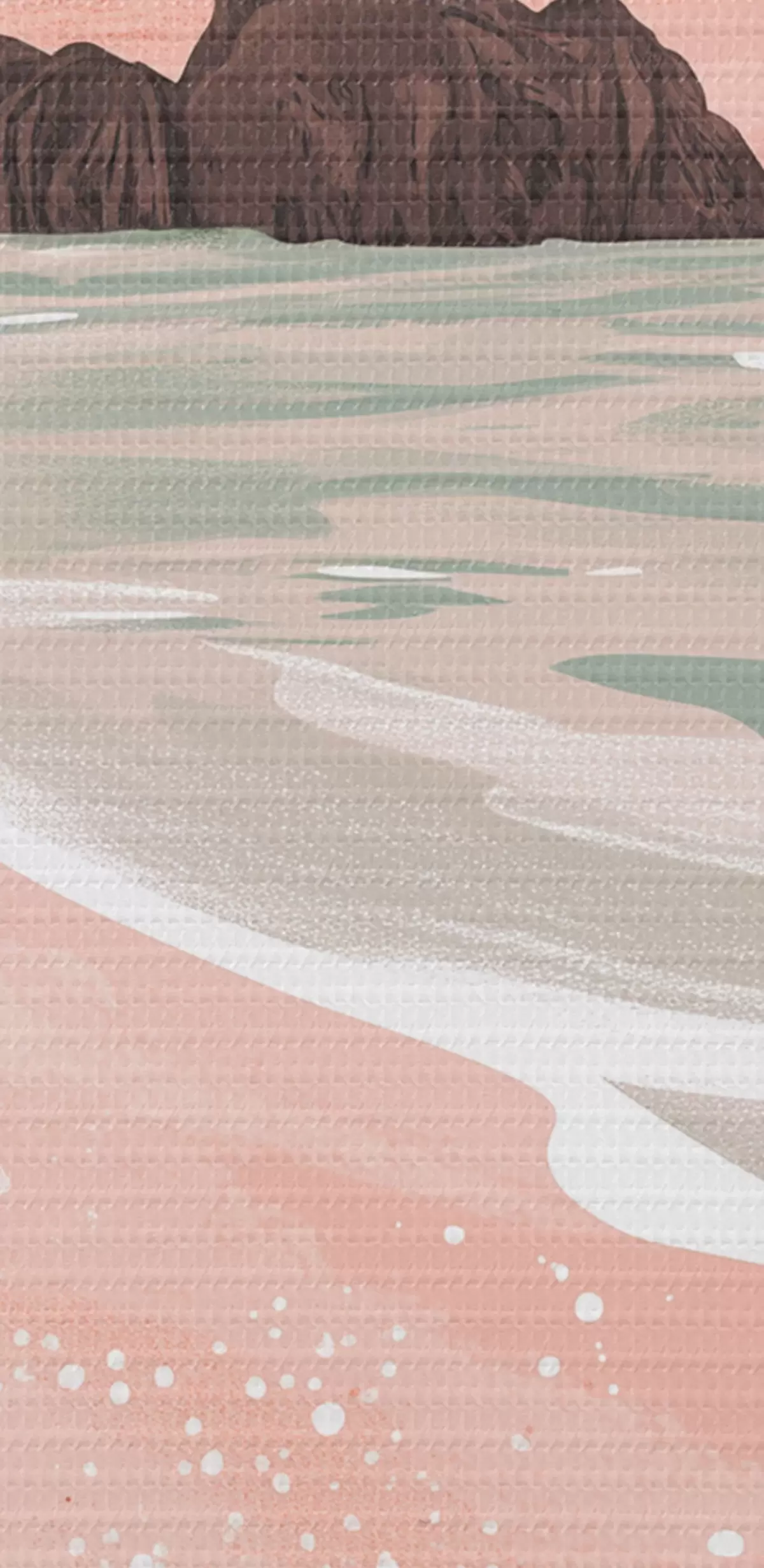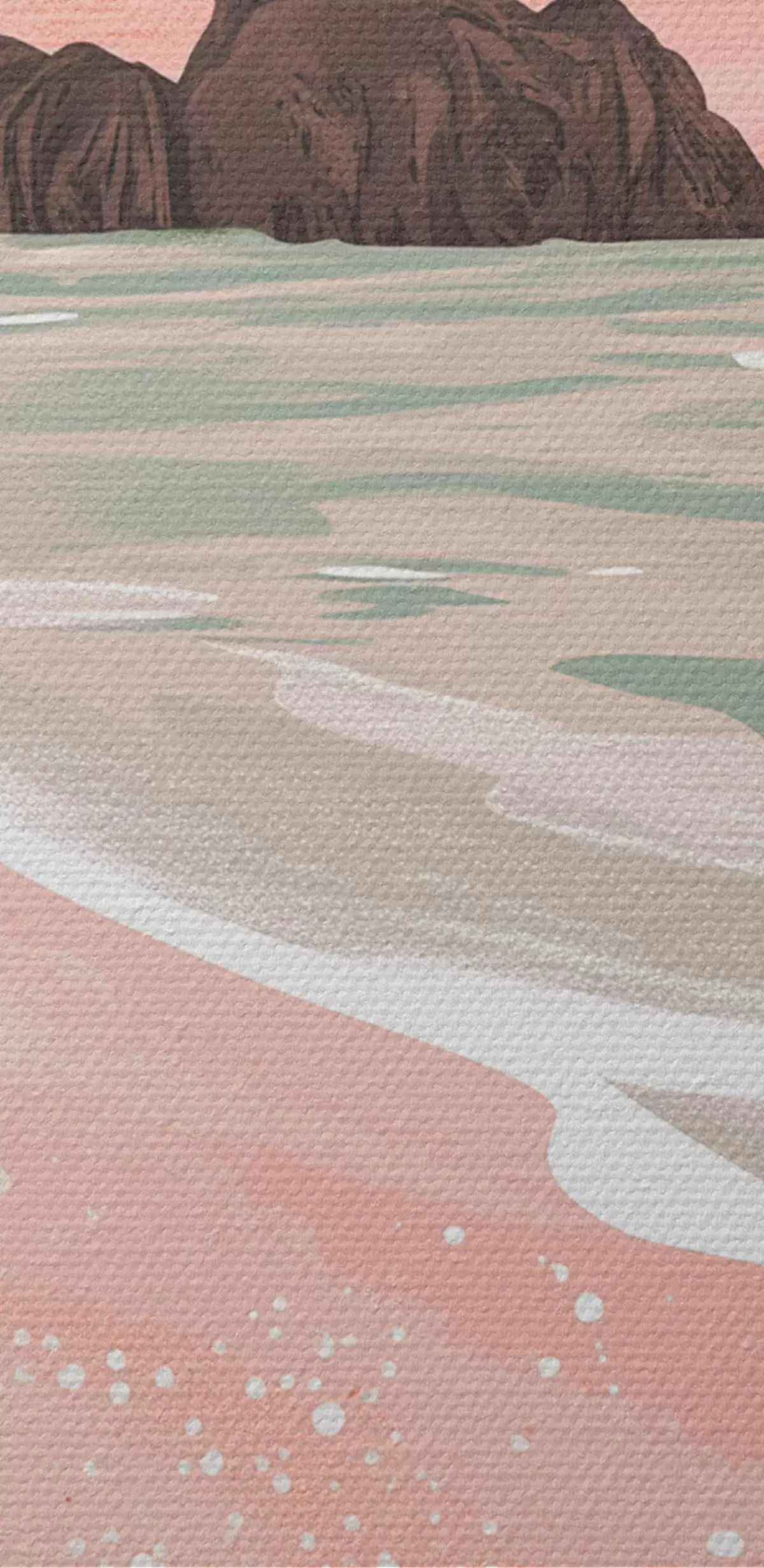 Vászonkép Hangulatos rózsaszín strand fehér házakkal és kagylókkal Nr s44713