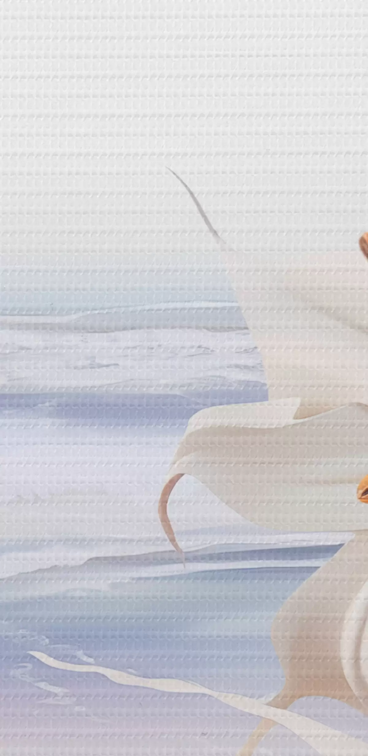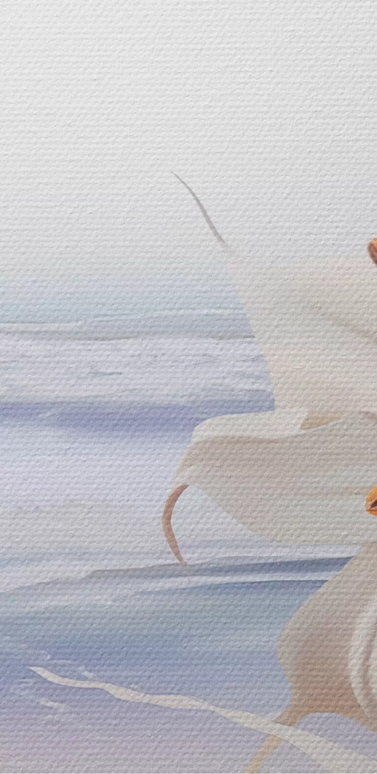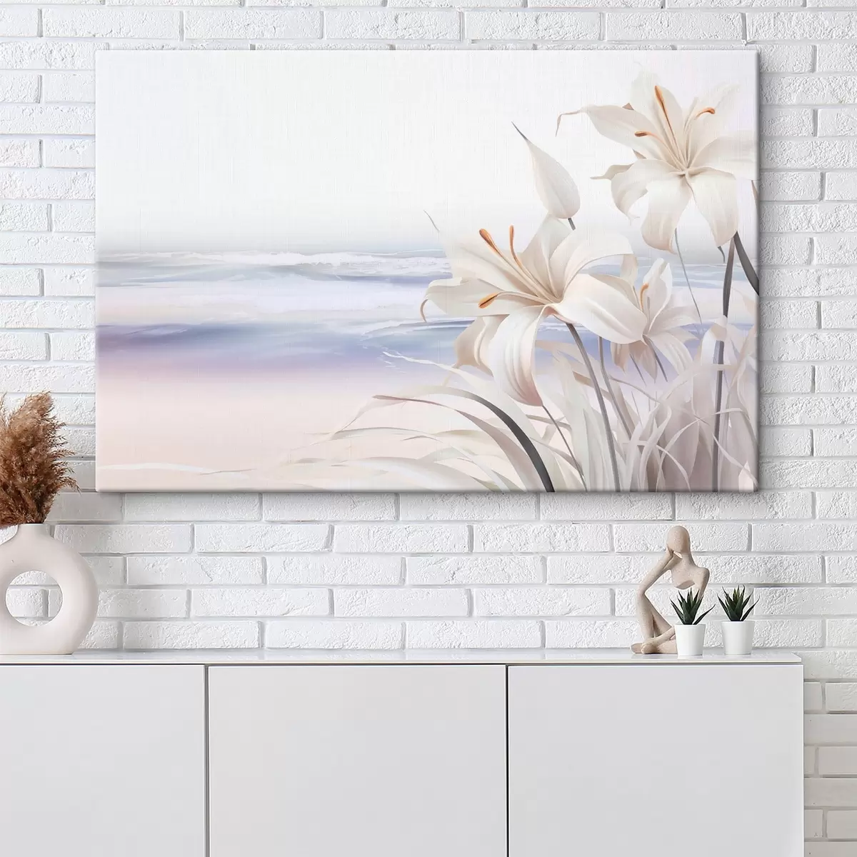 Vászonkép Fehér liliom narancssárga virágzattal és hosszú levelekkel a tengerparton, lágy hullámokkal a háttérben, pasztell színekben Nr s44850