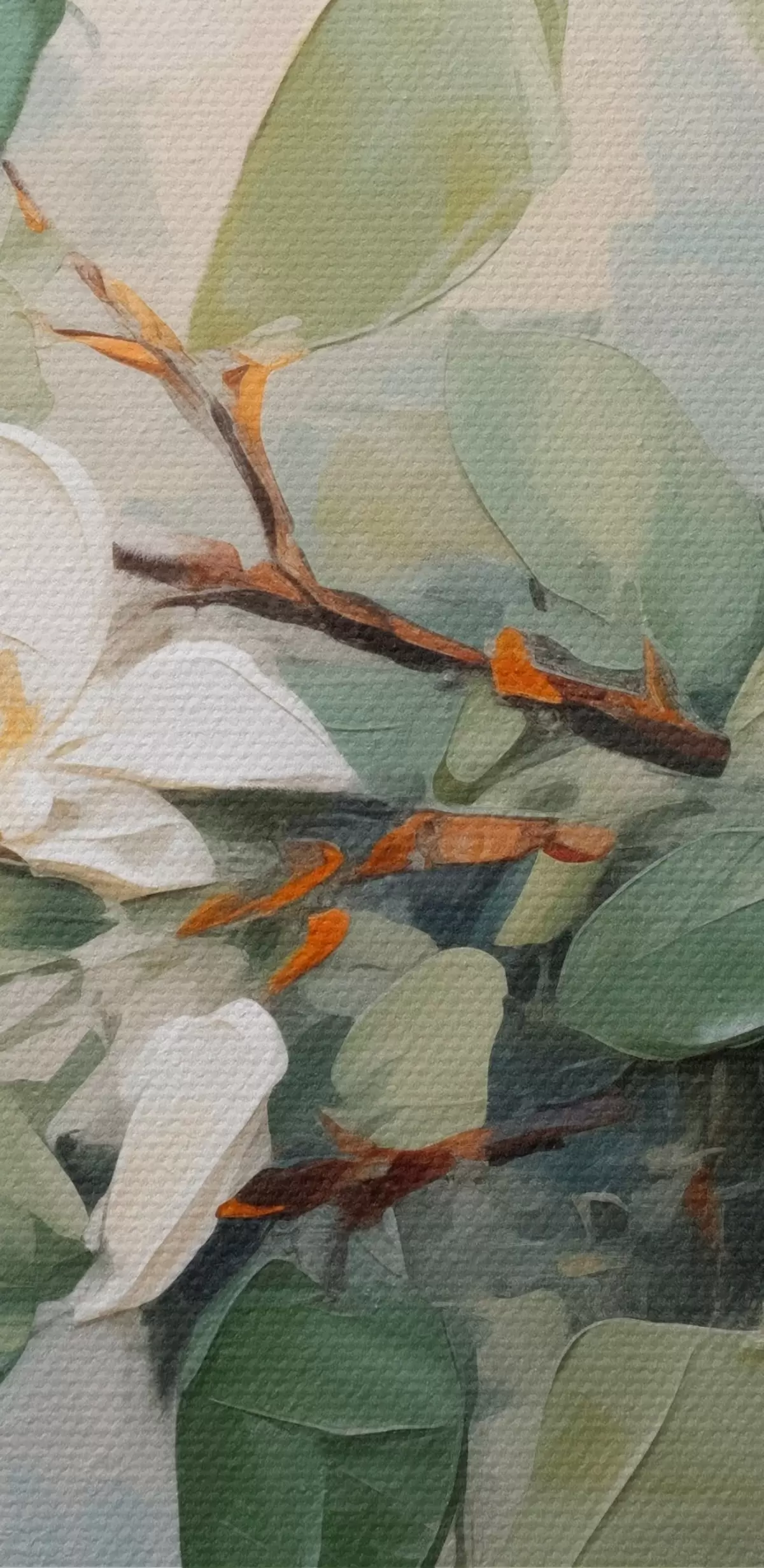 Vászonkép Magnólia virágok zöld levelekkel egy ágon, impasto texturált stílus, lágy színpaletta Nr s44853