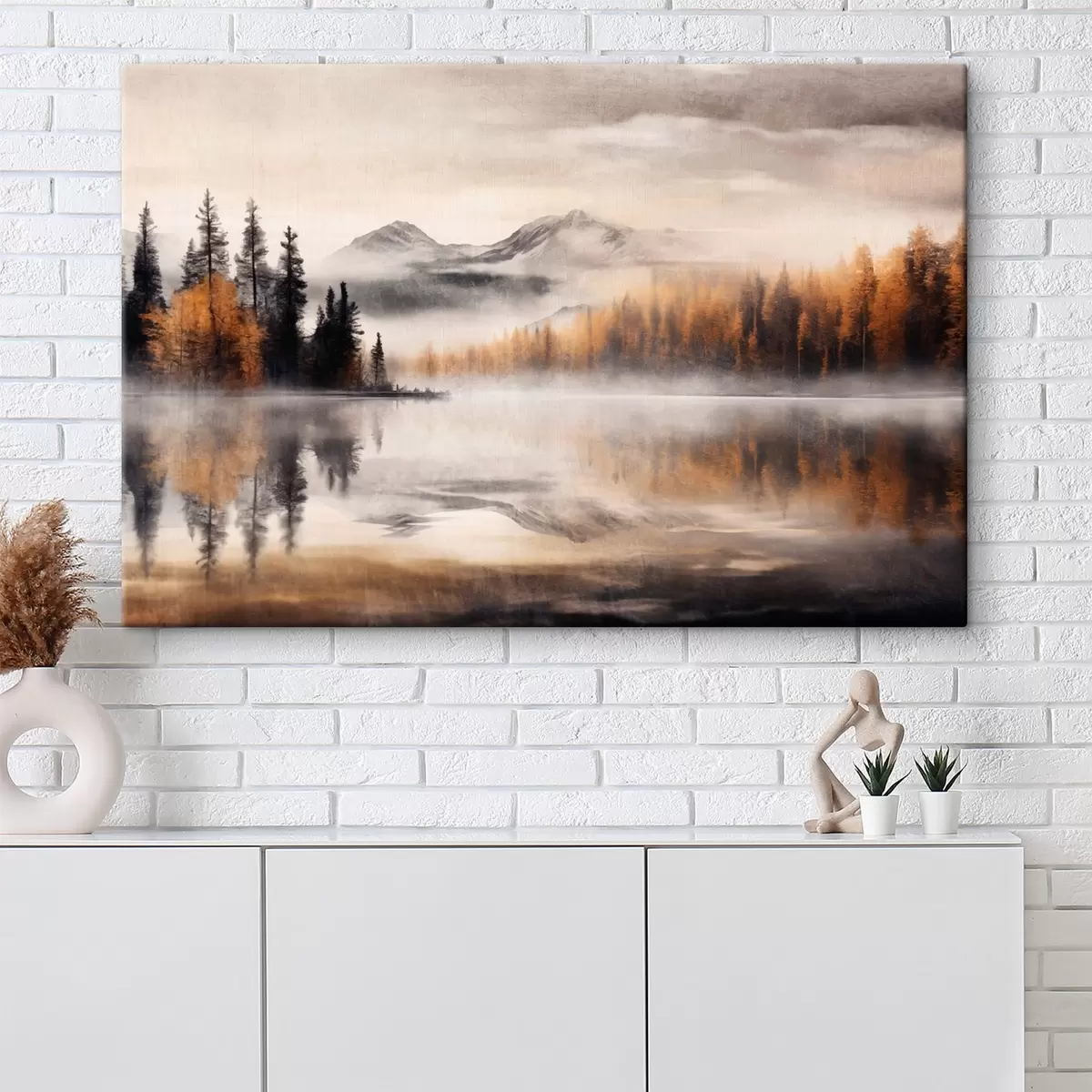 Vászonkép Ködös textúrájú tó táj fenyőfákkal és hegyekkel, felhős szürke égbolton Nr s44856