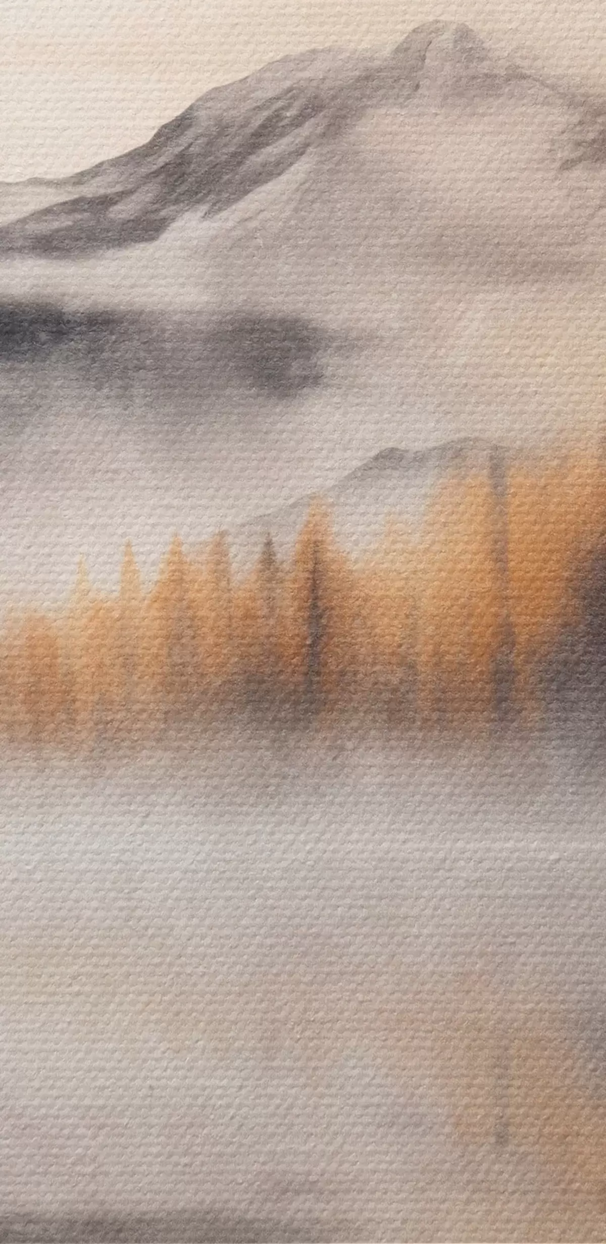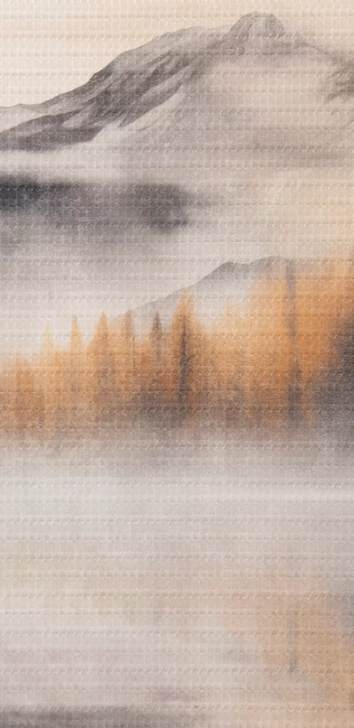 Vászonkép Ködös textúrájú tó táj fenyőfákkal és hegyekkel, felhős szürke égbolton Nr s44856