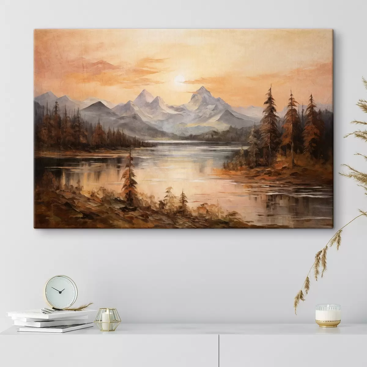 Vászonkép Tájkép egy tó körül fákkal és hegyekkel a háttérben, narancssárga égbolt a napfénnyel Nr s44857