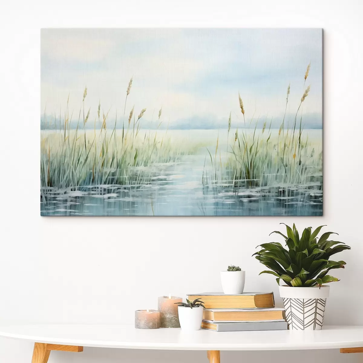 Vászonkép Akvarell festmény utánzata magas fű nő a víz mellett , borult ég és elmosódott háttérrel Nr s44860