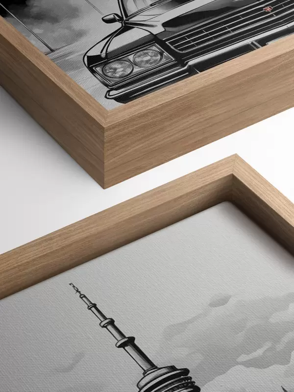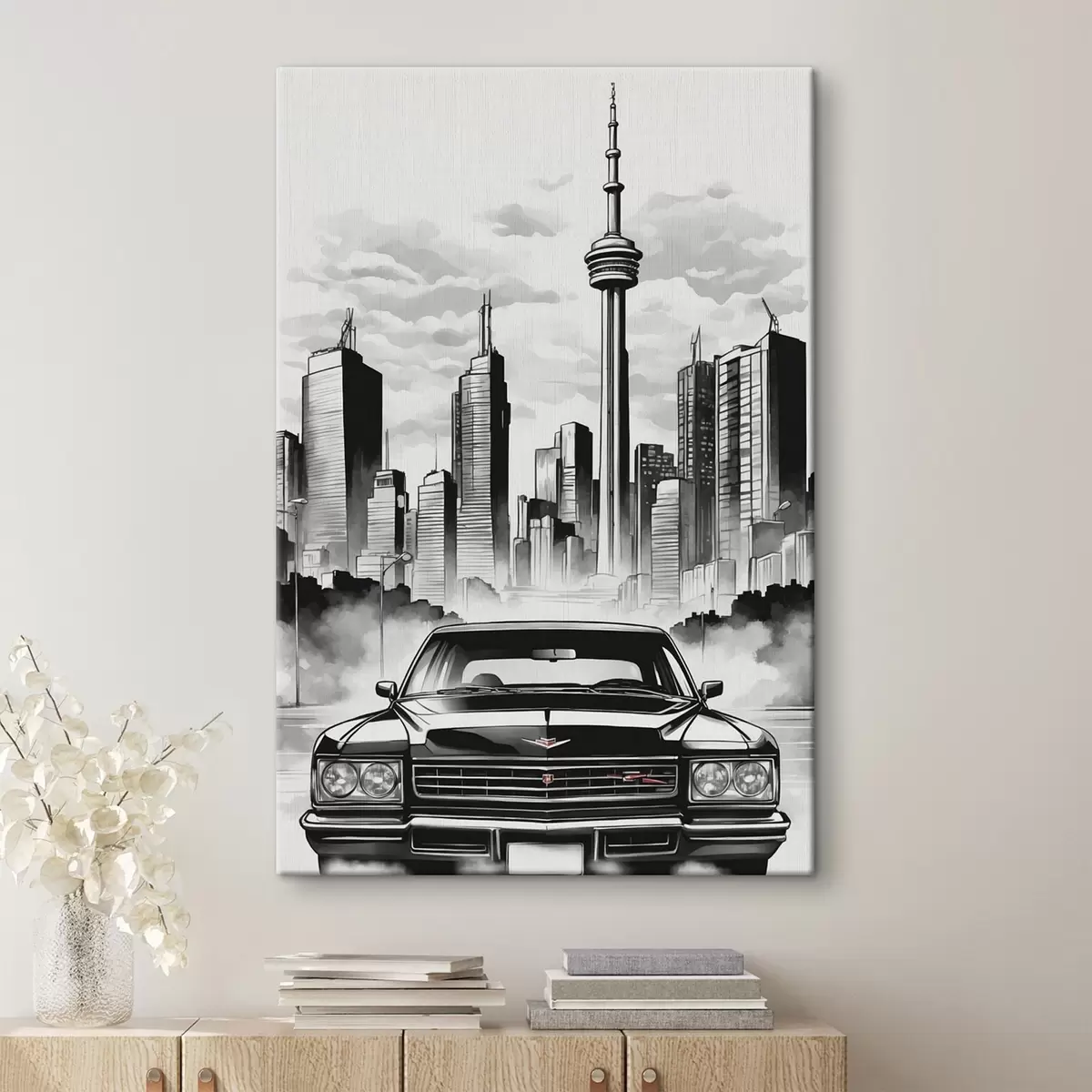 Vászonkép Retro autó a háttérben a monokróm város felhőkarcolókkal Nr s44871