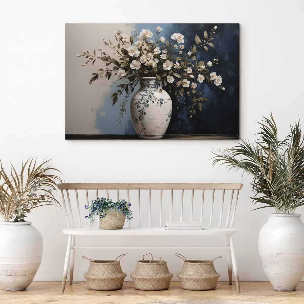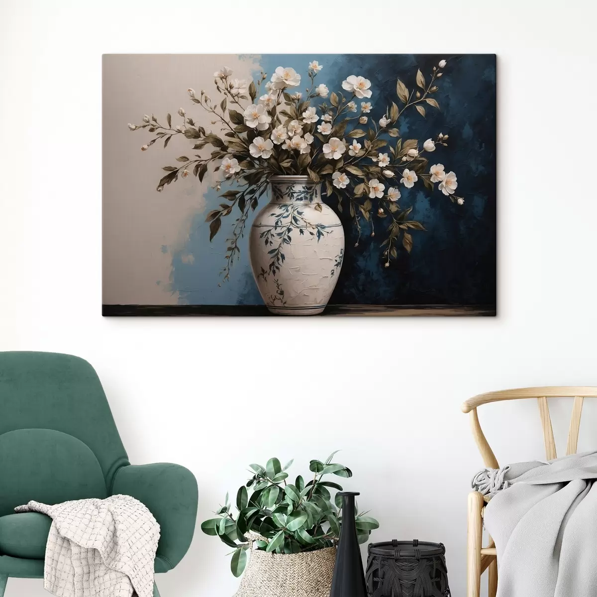 Vászonkép Fehér és sárga virágok egy nagy vázában kék háttérrel Nr s44893