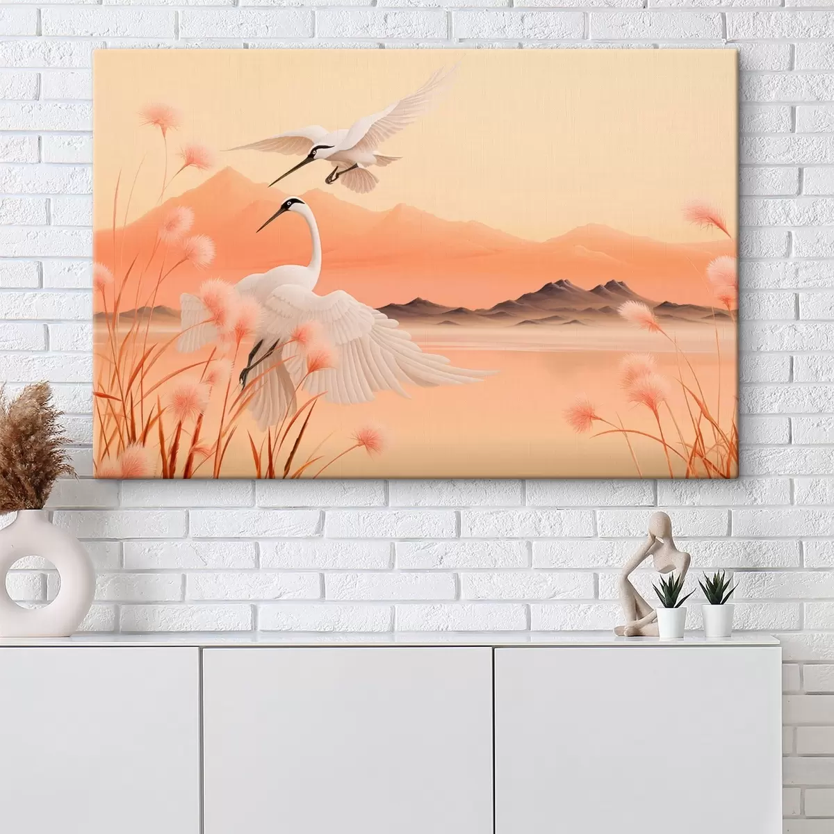 Vászonkép Fehér darvak rózsaszín náddal az előtérben, hegyek és egy tó a háttérben, lágy narancssárga fényben Nr s44925