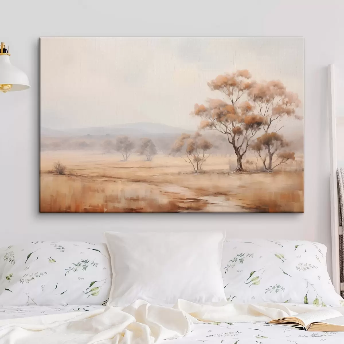 Vászonkép Egy mező narancssárga fűvel és néhány narancssárga levelű fával, a háttérben hegyek felhős égbolton Nr s44927