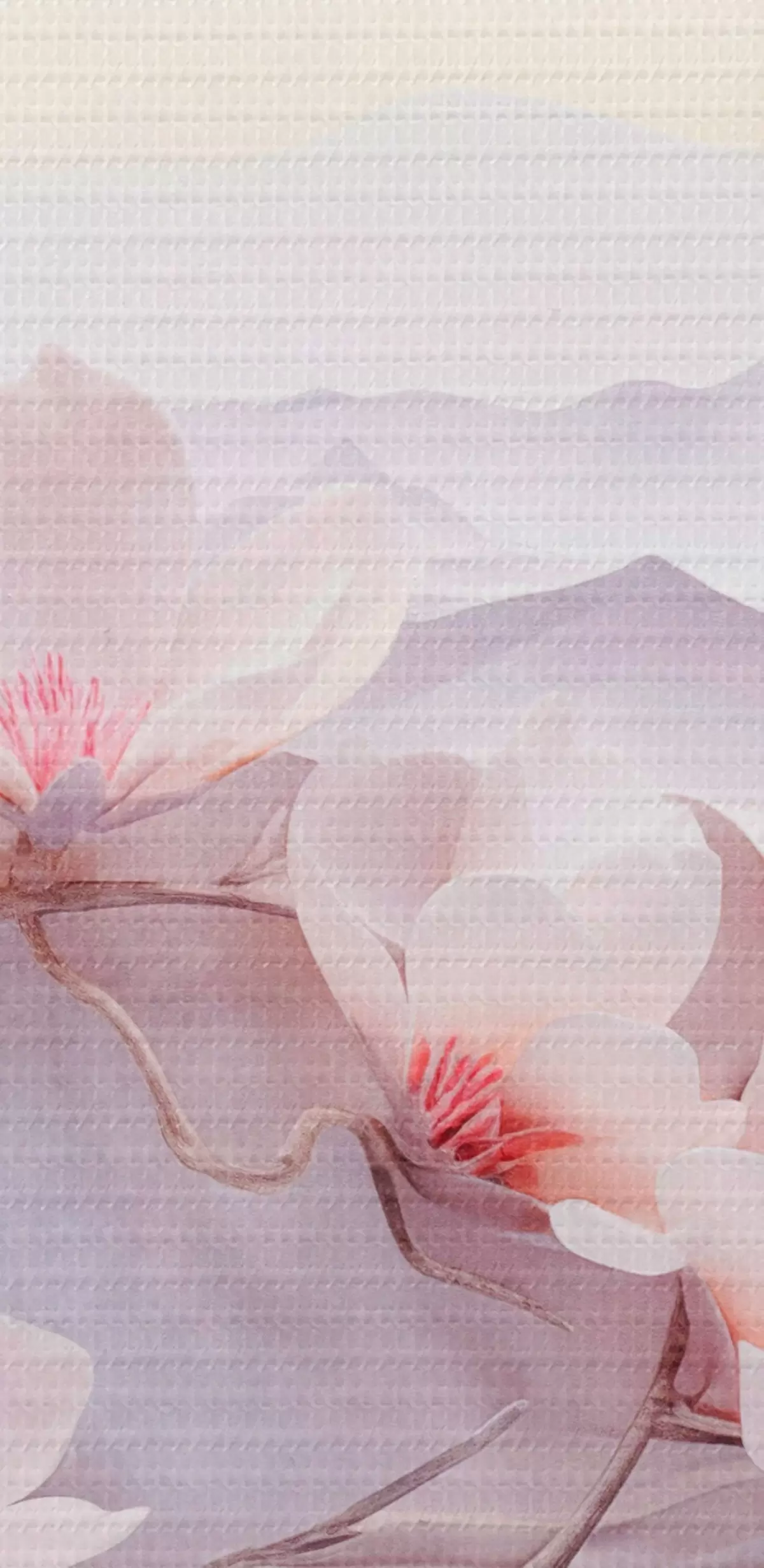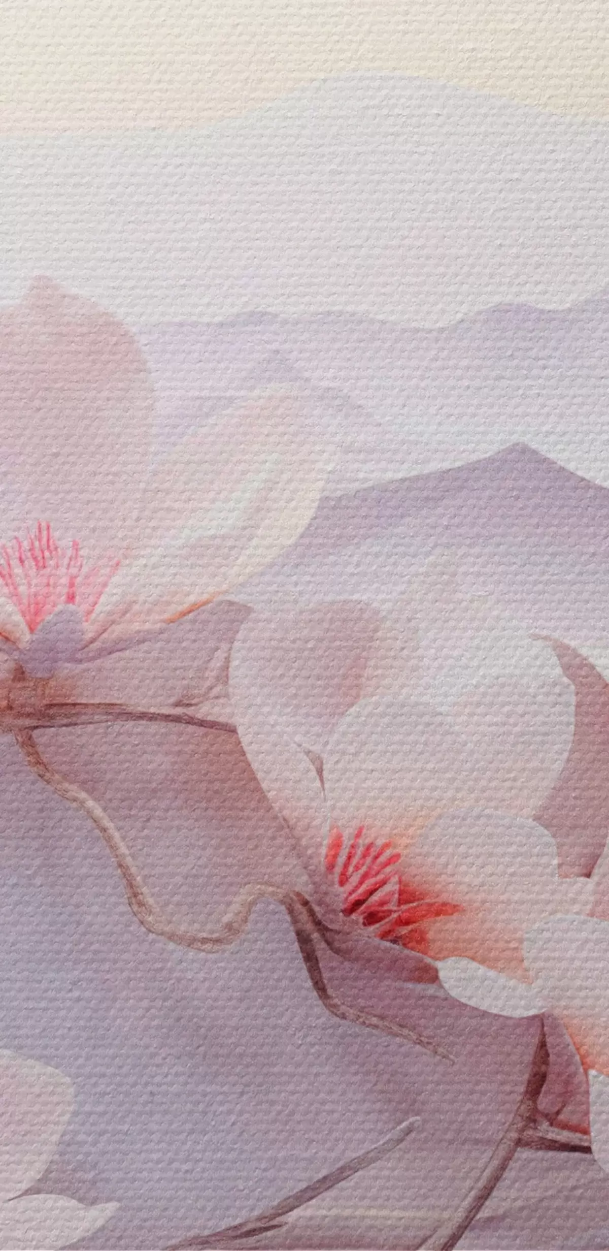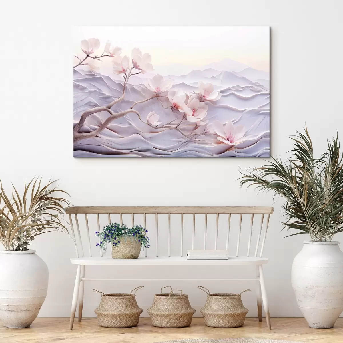 Vászonkép Virágos ág rózsaszín virágokkal, hegyek a háttérben, lágy pasztell színek, japán texturált művészet Nr s44930