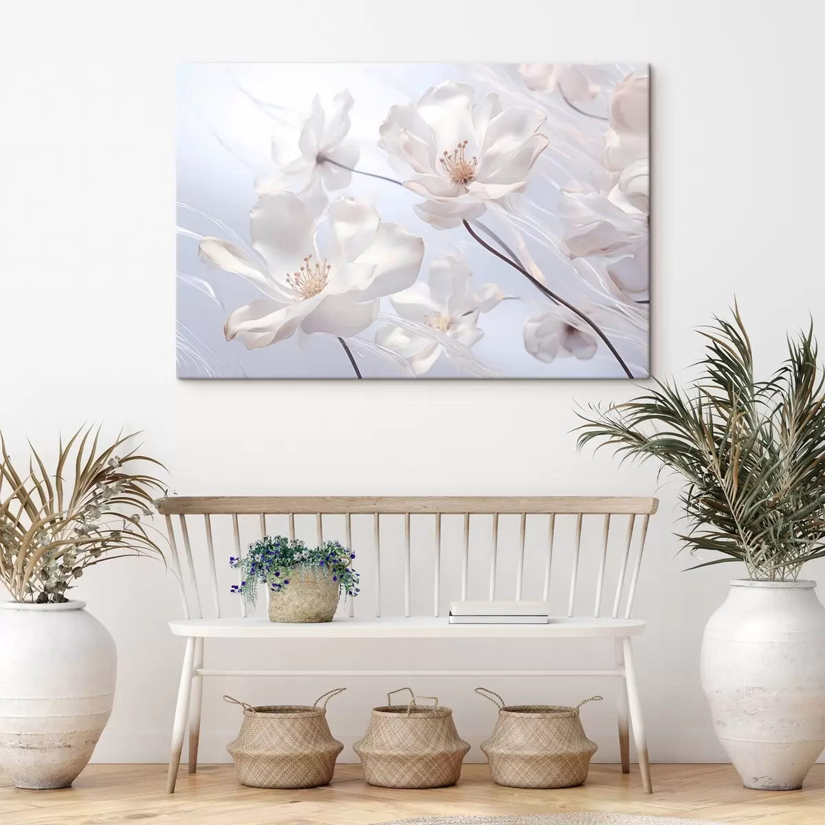 Vászonkép Fehér virágok áttetsző szirmokkal, lágy világoskék háttérrel, elegáns, romantikus, finom, álmodozó Nr s44931