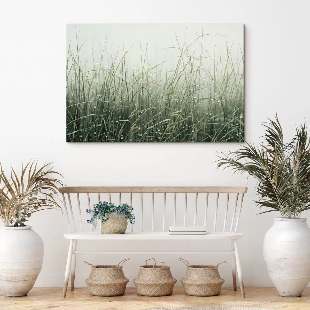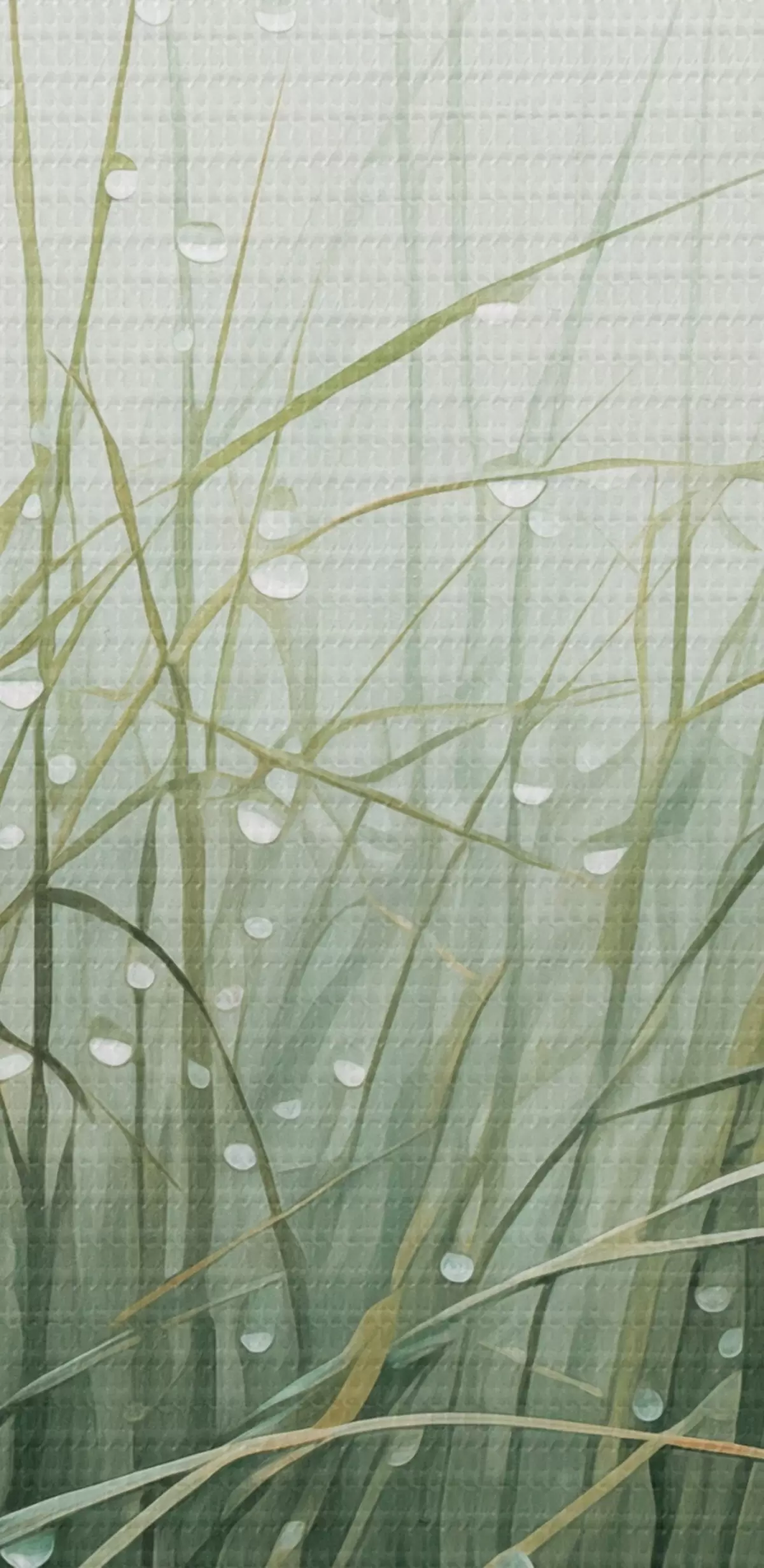 Vászonkép Fű vízcseppekkel, zöld árnyalatok, lágy fény, ködös háttér, absztrakt minimalista texturált stílusban Nr s44932