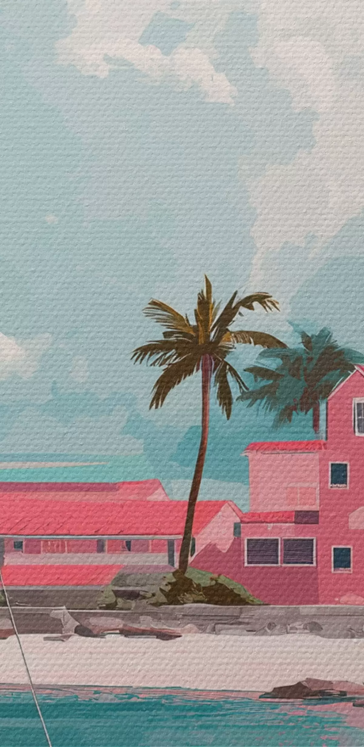 Vászonkép Rózsaszín strand ragyogó napsütéssel, vitorlással és házakkal Nr s44986