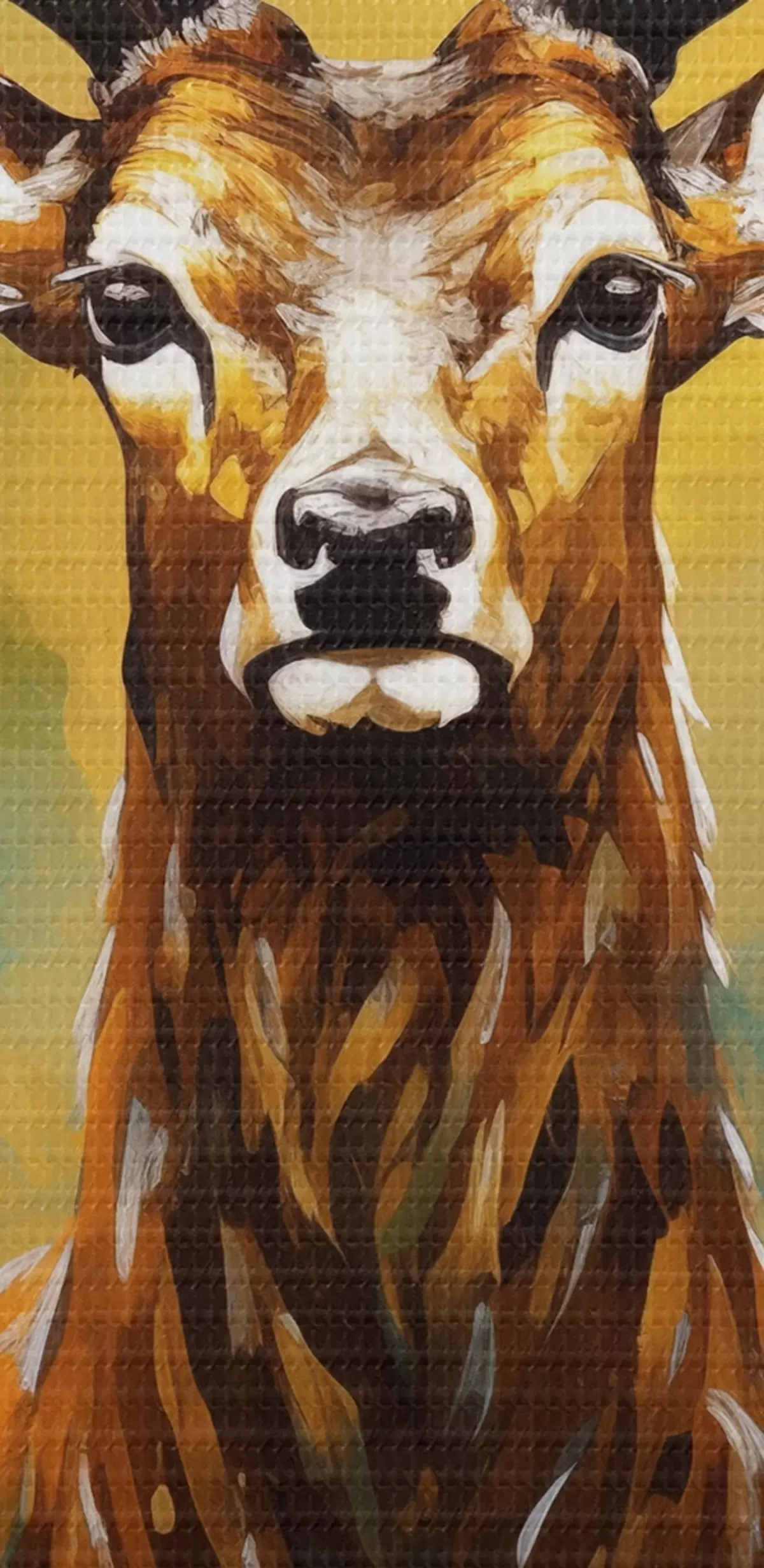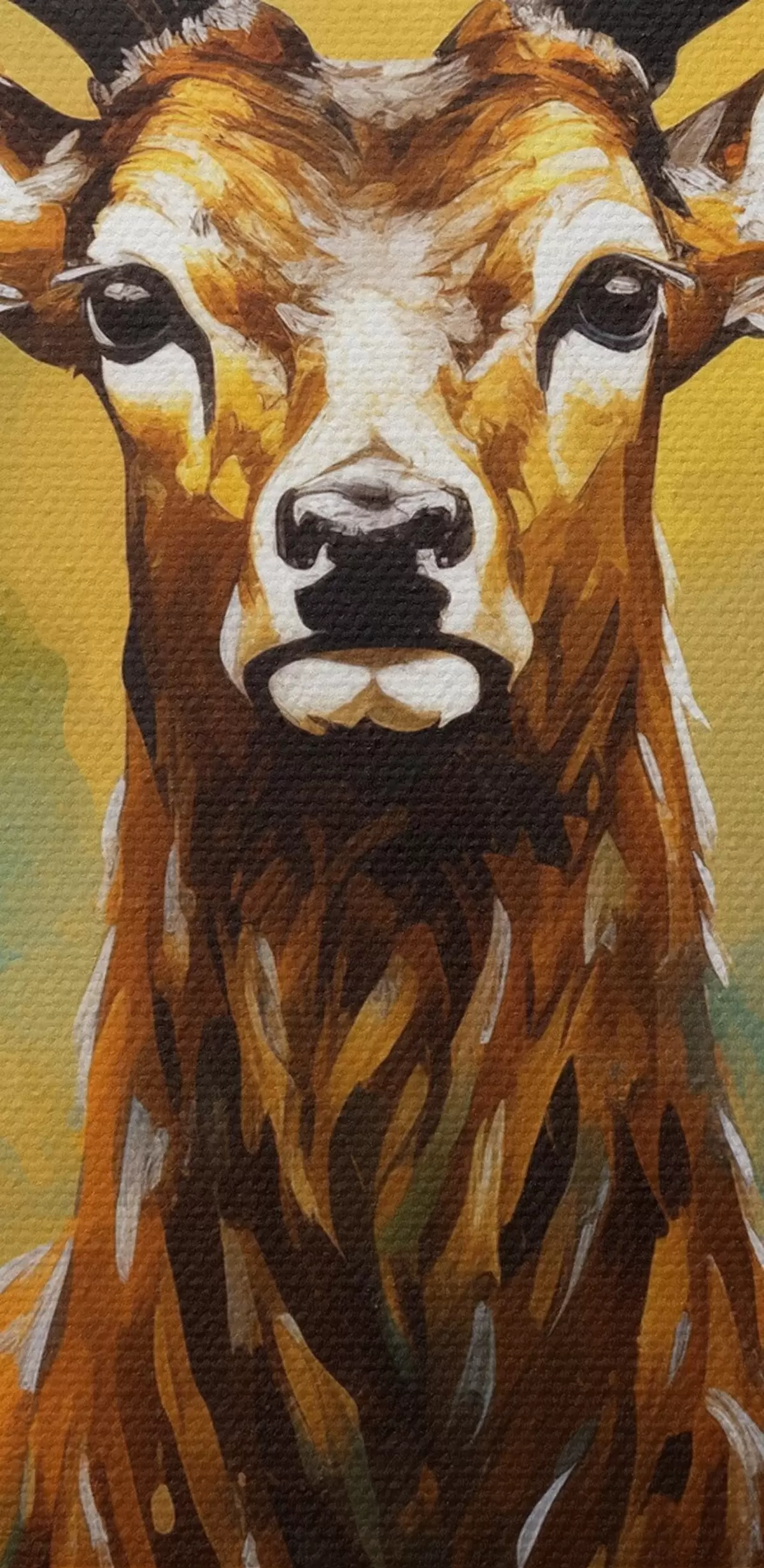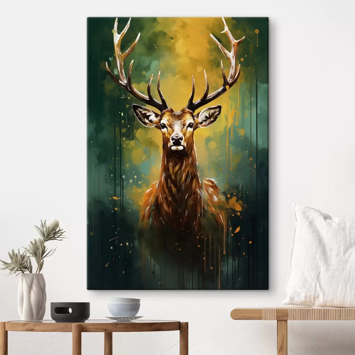 Vászonkép szarvas, agancs, erdő zöld, narancssárga fröccsenés, állat portré, festék csepp, merész, vadvilág Nr s45111