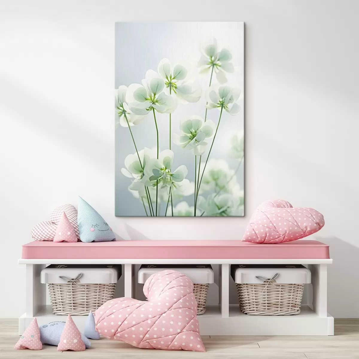 Vászonkép Fehér lóhere virágok zöld szárral és levelekkel, lágy megvilágítás, tiszta háttér, minimalista kompozíció, botanikai képek Nr s45172