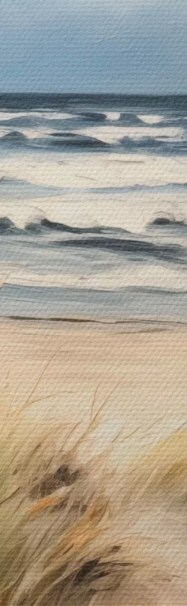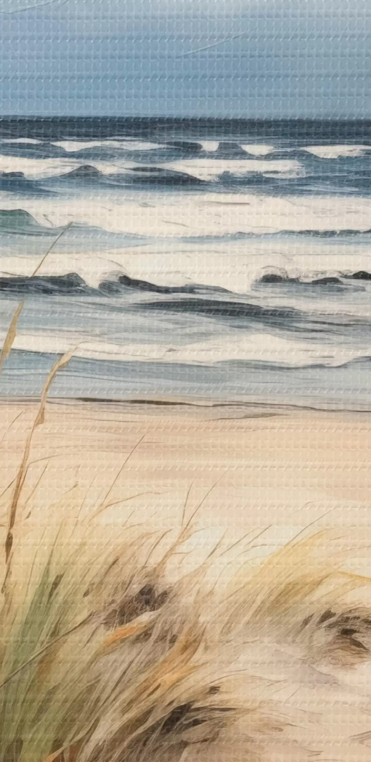 Vászonkép Homokos tengerpart magas fűvel az előtérben, az óceán hullámokkal és felhős égbolt a háttérben Nr s45173