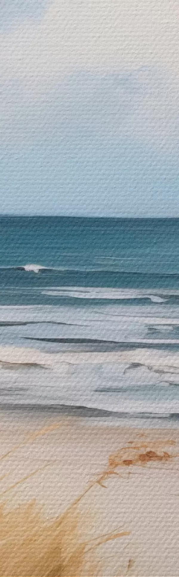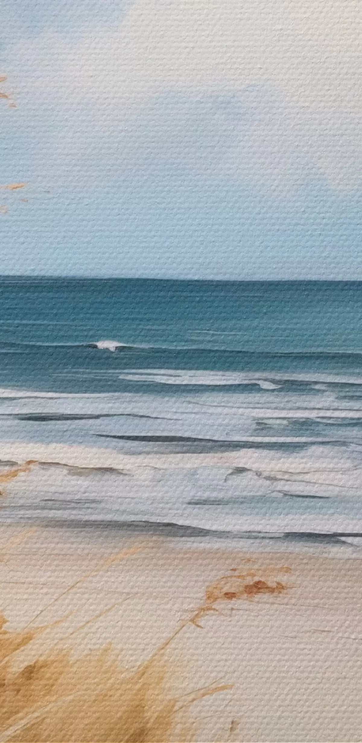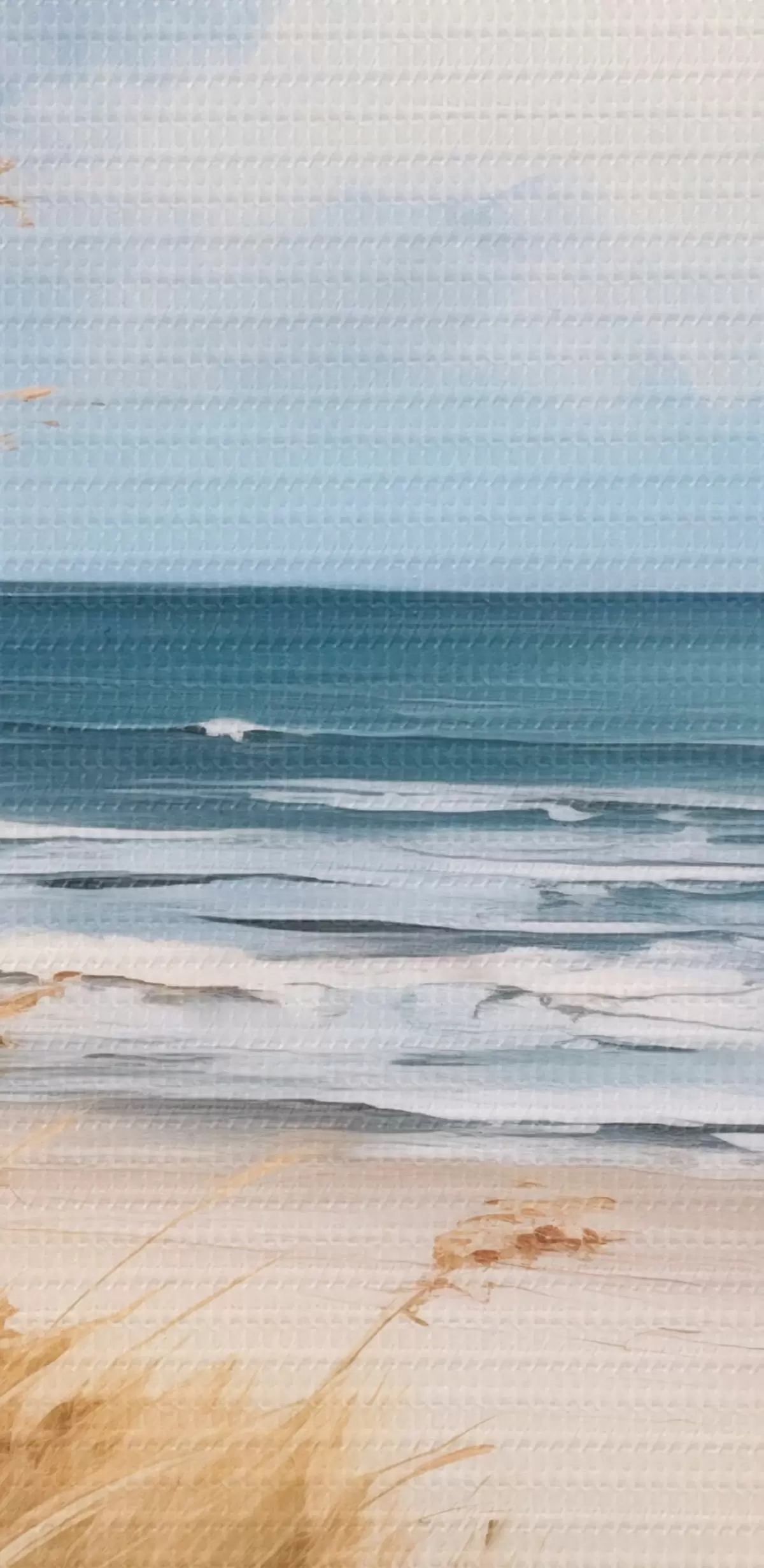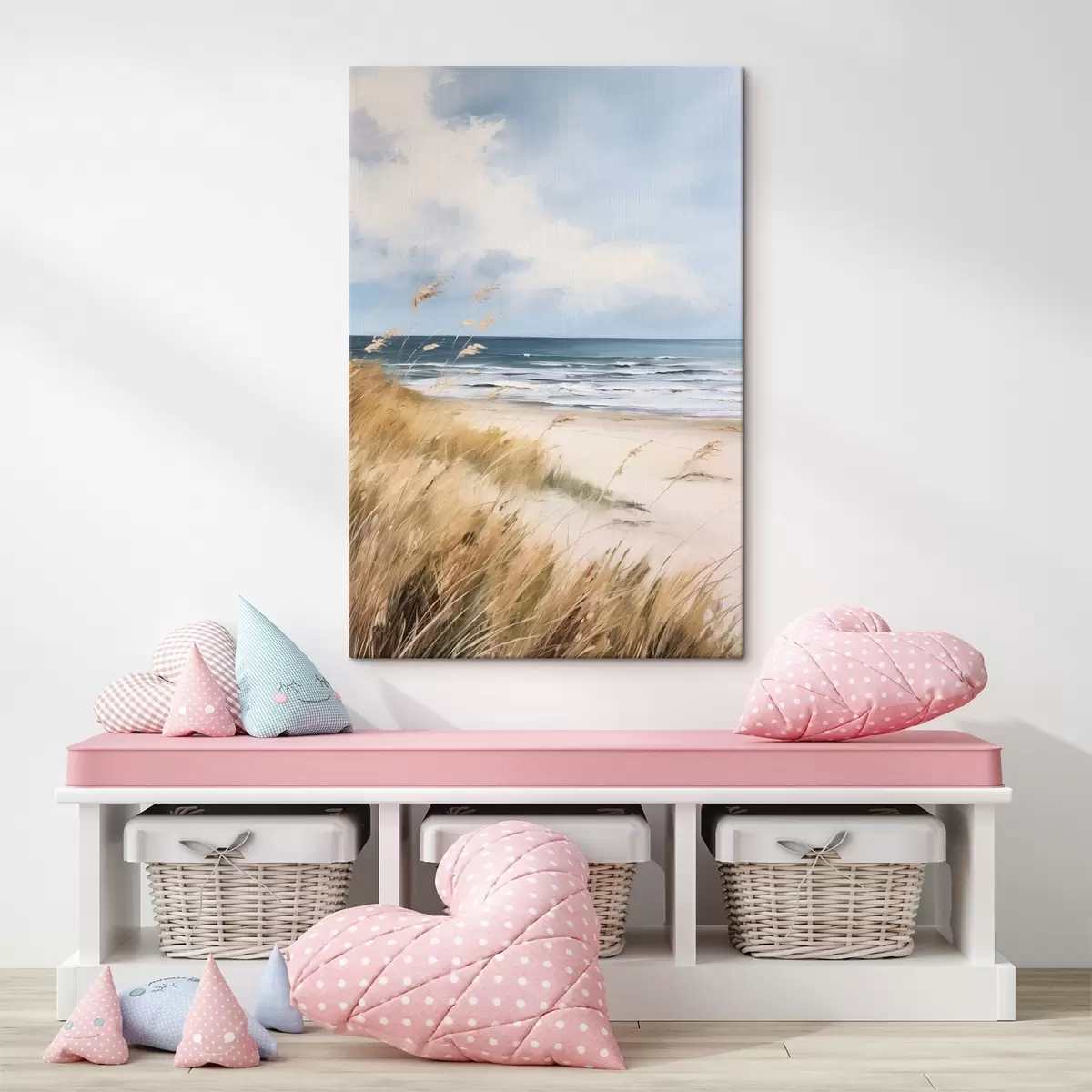 Vászonkép Homokos tengerpart magas fűvel az előtérben, az óceán hullámokkal és felhős égbolt a háttérben Nr s45174